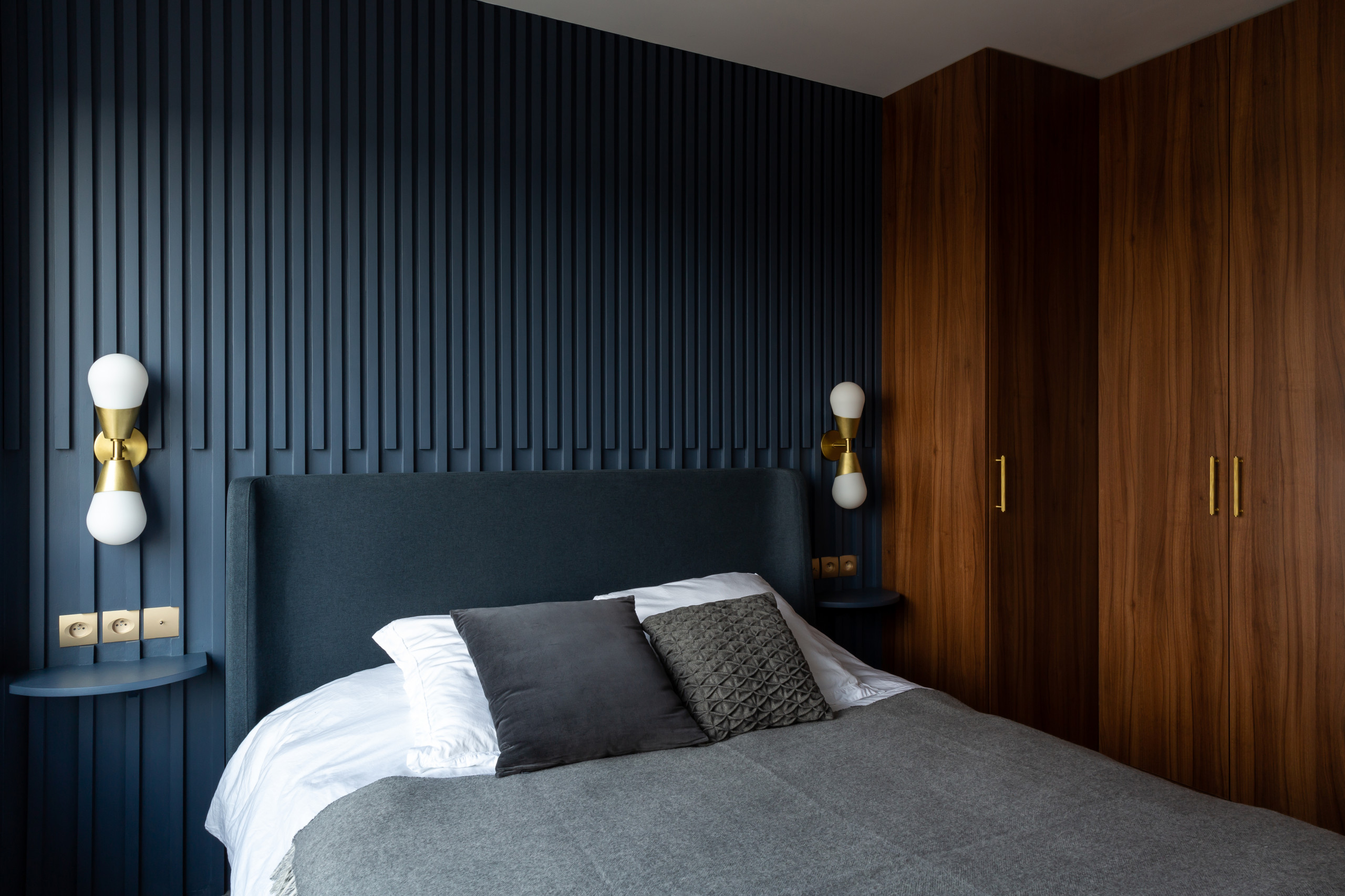 Le dressing, réalisé sur mesure en placage noyer, a également une vocation acoustique. Anne explique : « La problématique d’atténuation phonique était essentielle dans cette chambre car nous avons placé le studio indépendant juste derrière. Le couple m’a également demandé d’isoler avec soin la tête de lit et nous avons donc doublé le mur sous les tasseaux. »
