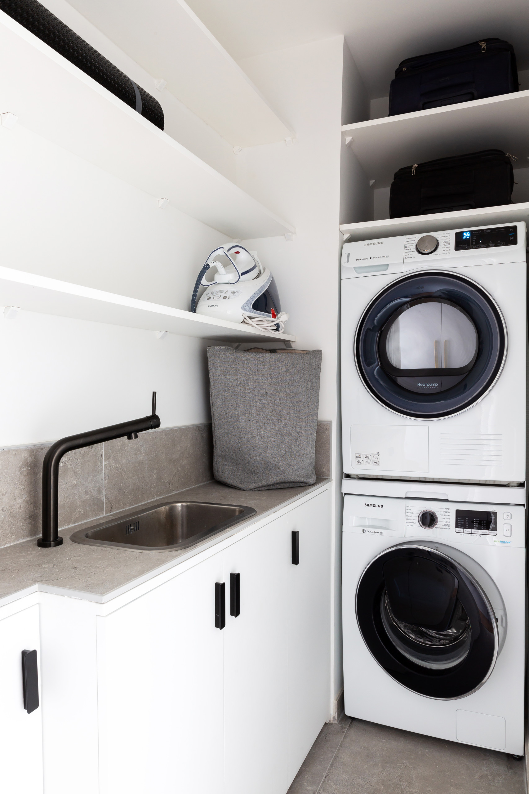 C’est aussi dans cette buanderie que les valises ont trouvé leur place. « Elles encombraient mes clients dans leur ancien appartement et ils m’ont mentionné tout de suite qu’ils souhaitaient que j’imagine un rangement dédié », indique-t-elle.