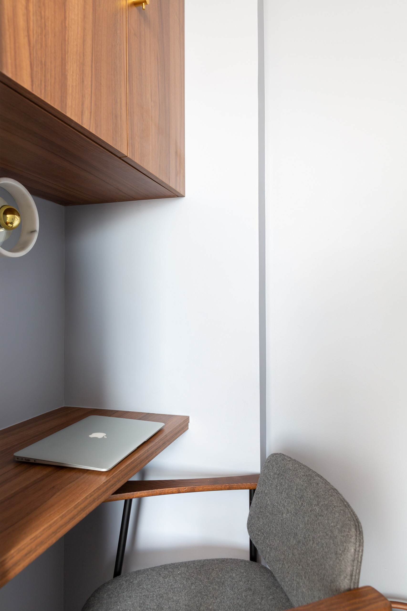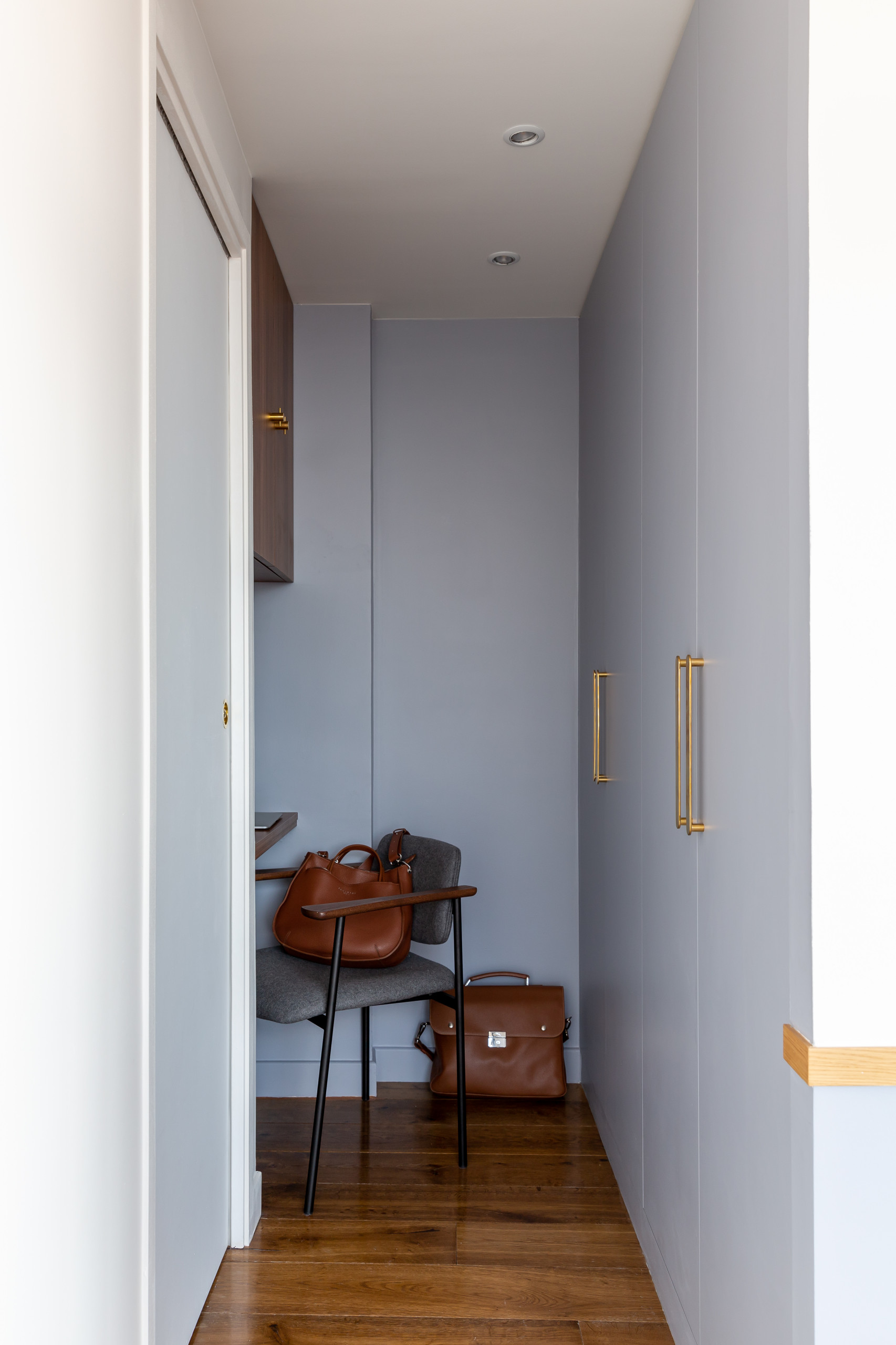 Au fond du dressing, au niveau de l’ancienne entrée, est venu se cacher un petit coin bureau. Ce n’était pas un aménagement auquel la famille avait pensé mais cette proposition de l’architecte d’intérieur a été chaudement accueillie en période de recrudescence du télétravail. Le mobilier a été réalisé sur mesure en placage noyer.