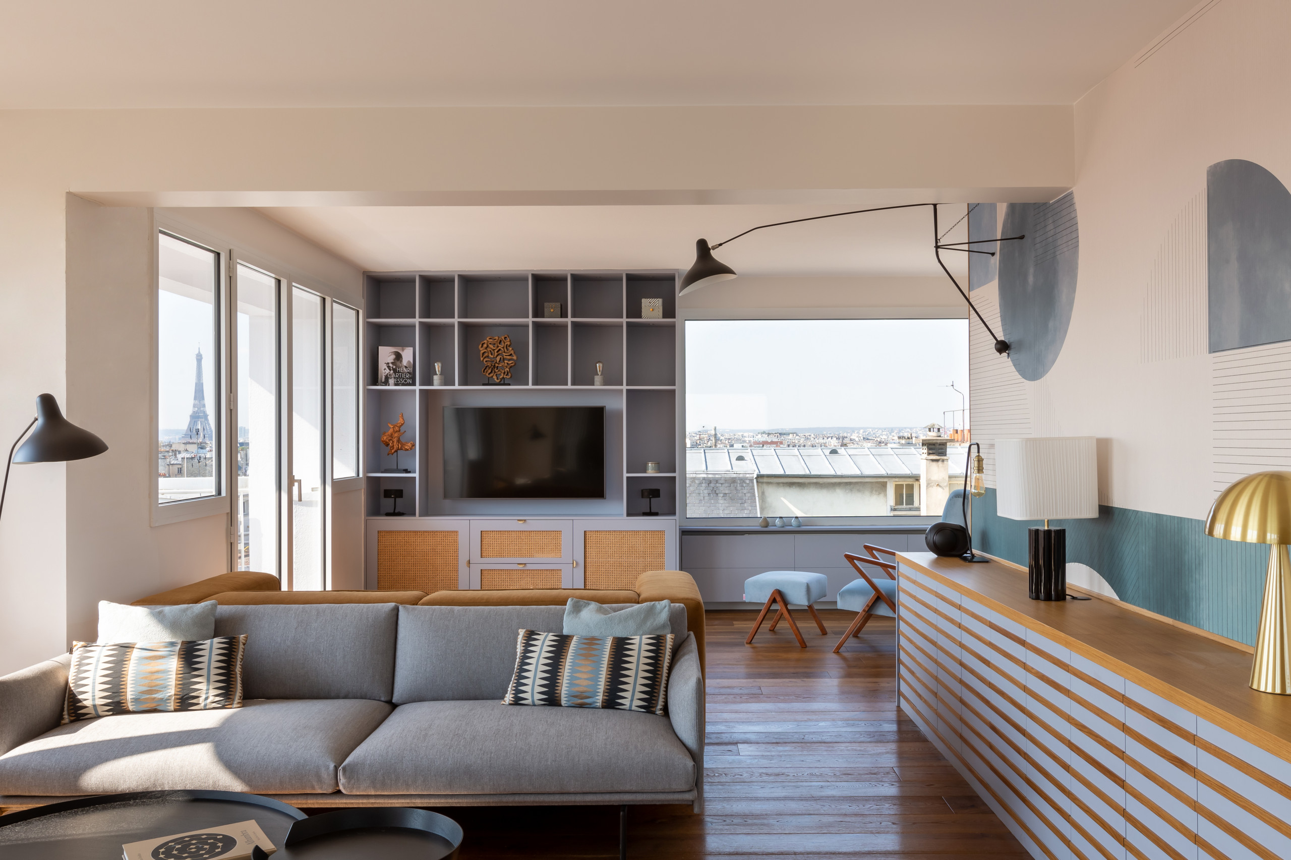 Le salon vintage a été rattaché à celui de la famille pour ne former qu’une seule pièce depuis laquelle on embrasse une vue rare, depuis l’Arc de Triomphe jusqu’à la tour Eiffel. Moyennant une demande au syndic de copropriété, deux fenêtres ont même été changées au profit de châssis fixes pour bénéficier d’une vue totalement dégagée.