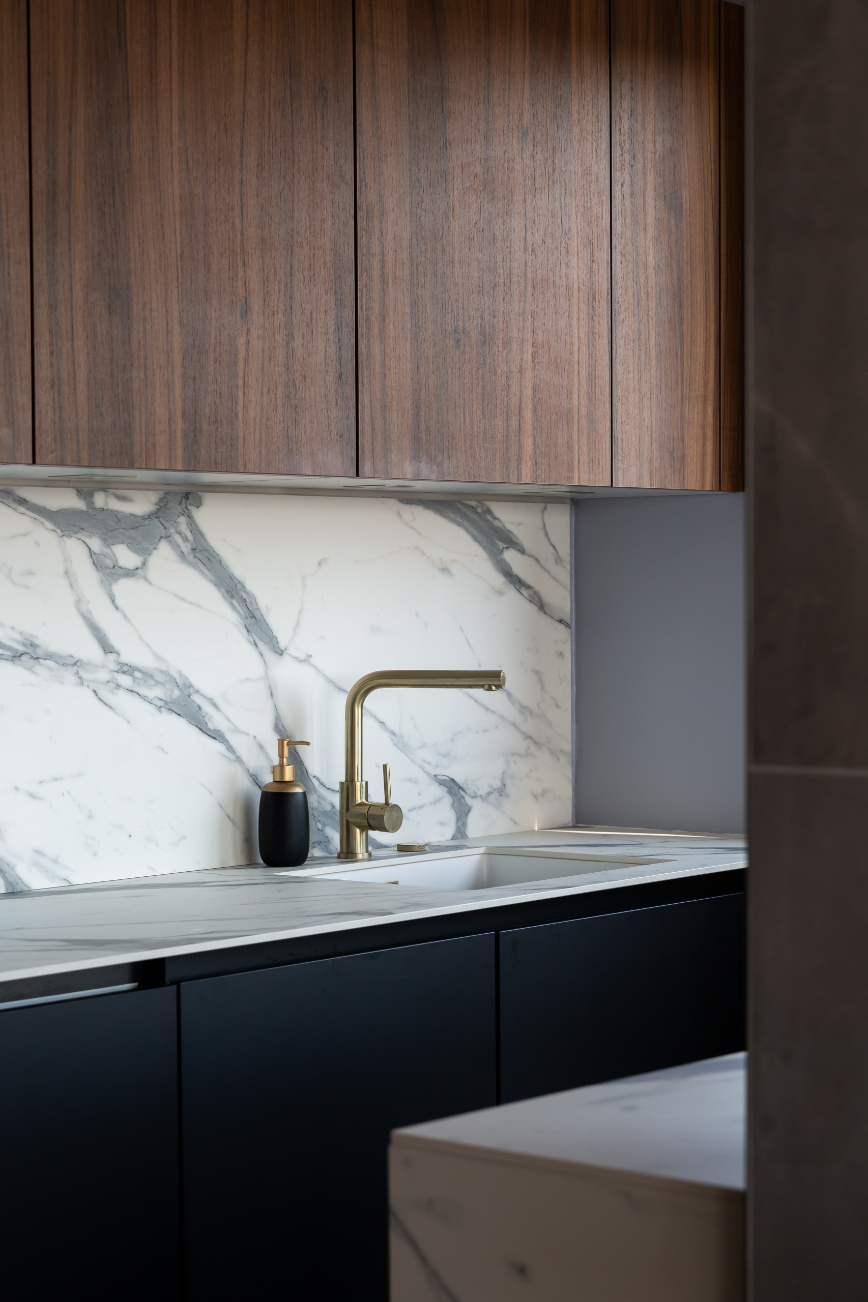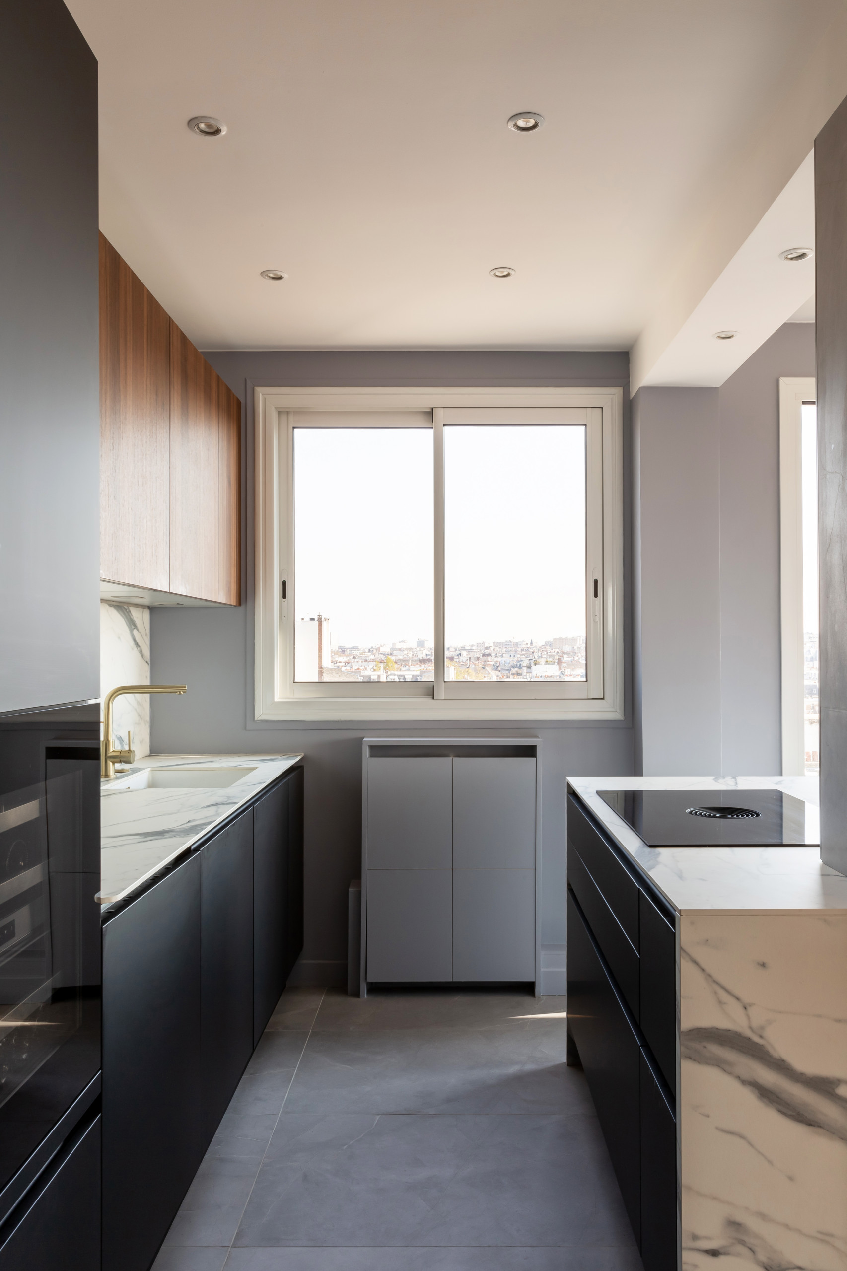 Après. Par ses matières et couleurs, la nouvelle cuisine, ouverte sur le séjour, participe à cette idée d’un luxe feutré. « Nous avons choisi une alliance de Fenix noir, de marbre et de noyer », détaille Anne.