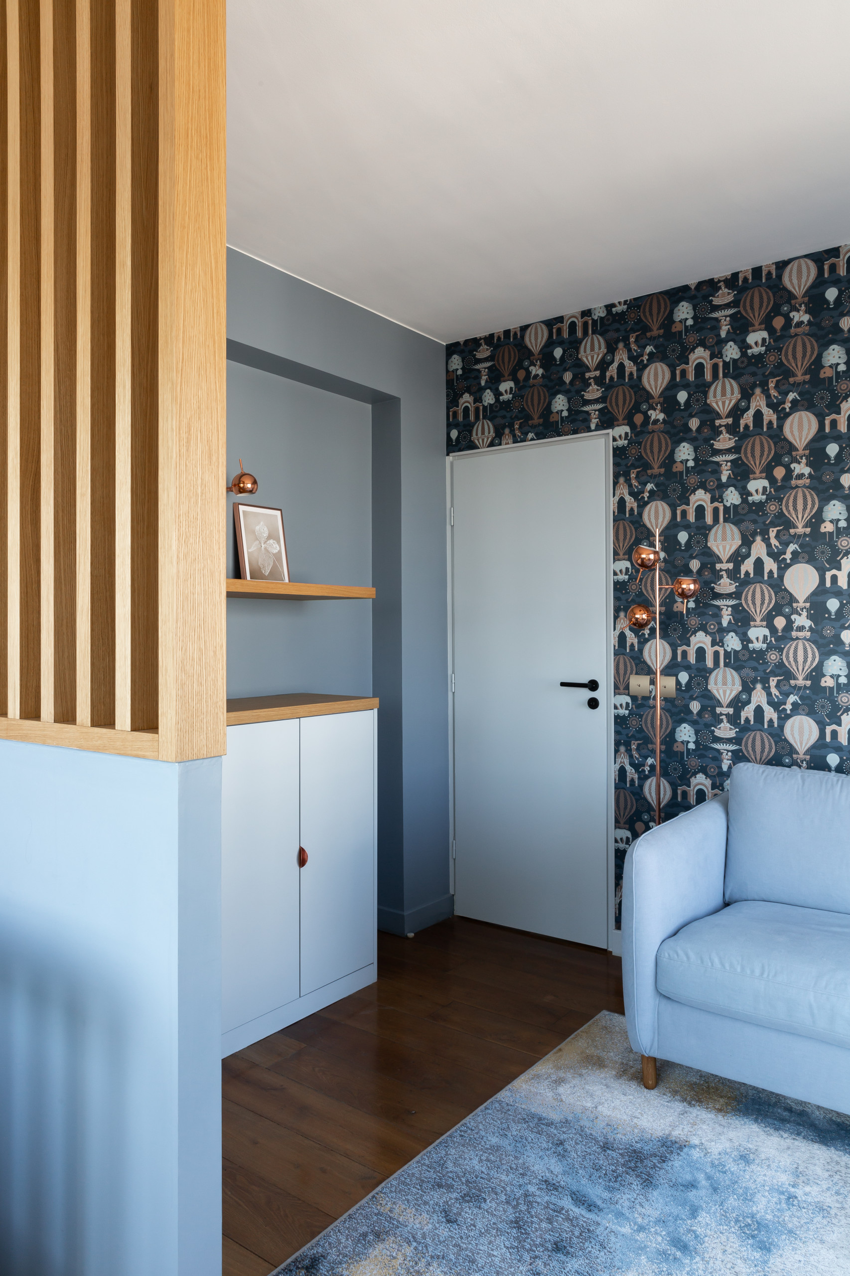 Pour animer le mur latéral, un papier peint panoramique, composé sur mesure, joue sur des formes géométriques chères au style Streamline moderne, marié à une palette de bleus qui sublime les lieux.