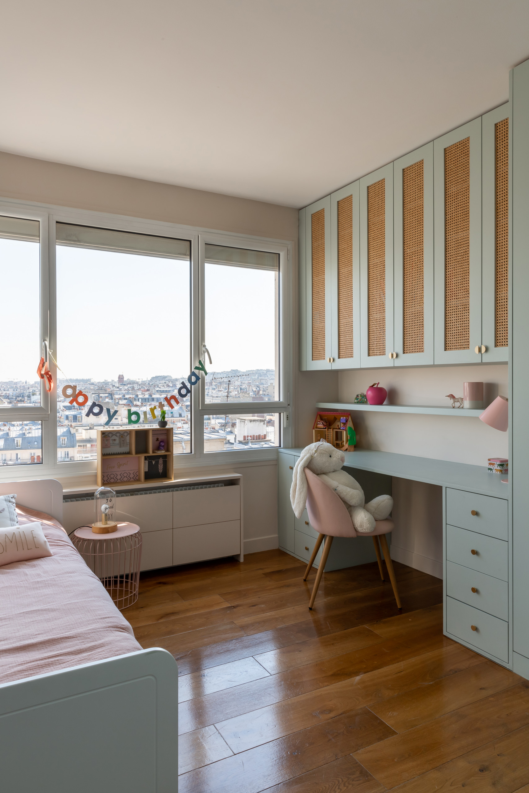 Après. Voici la chambre de la fille aînée, composée sur la base d’un duo vert tendre et blanc craie rosé.