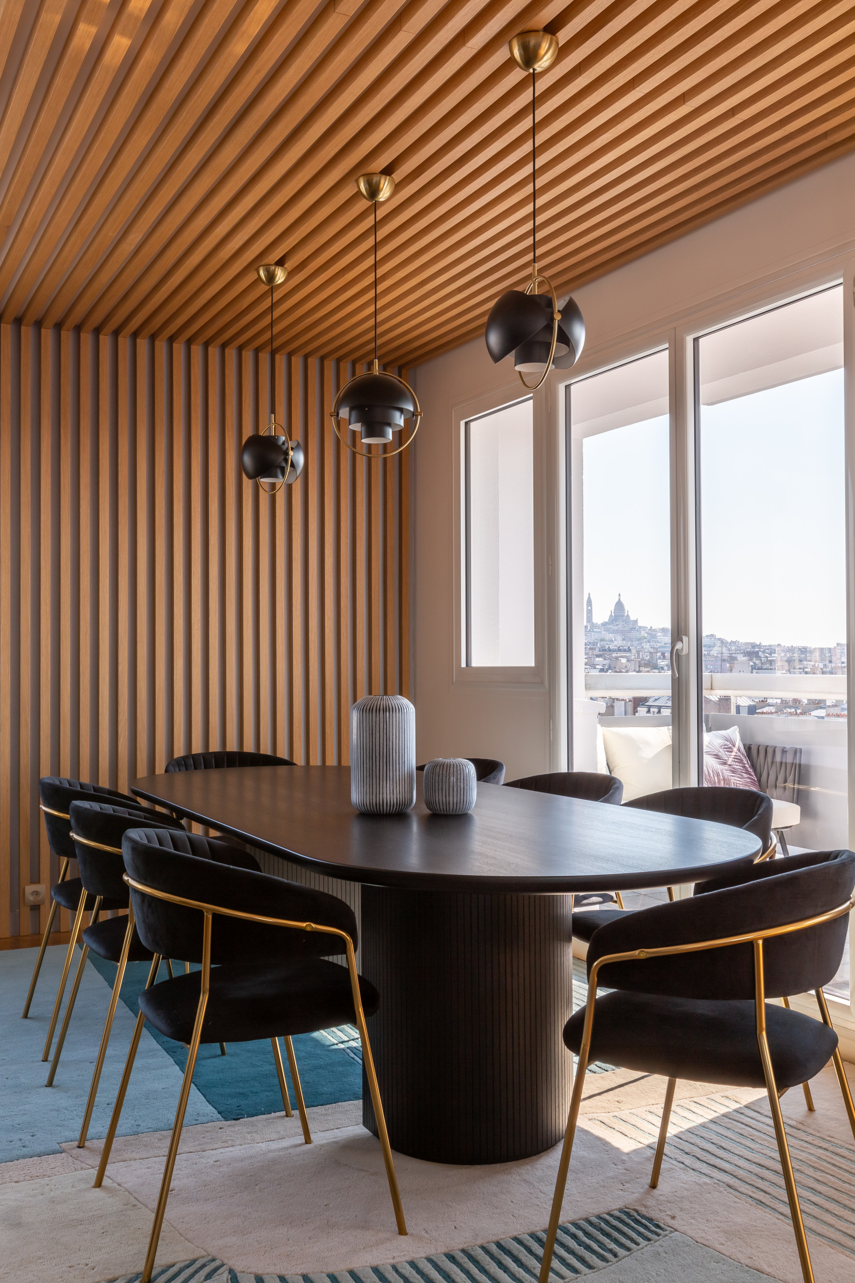 Pour ces propriétaires qui ont indiqué aimer recevoir, la salle à manger a été taillée afin d’accueillir 8 à 10 convives. Le choix de la table noire a été guidé par son pied cannelé dont la forme rappelle la cheminée d’un paquebot. Les chaises et les lampes font écho aux accessoires laitonnés des transatlantiques et le tapis, dans différents tons de bleu, évoque la mer bien sûr.