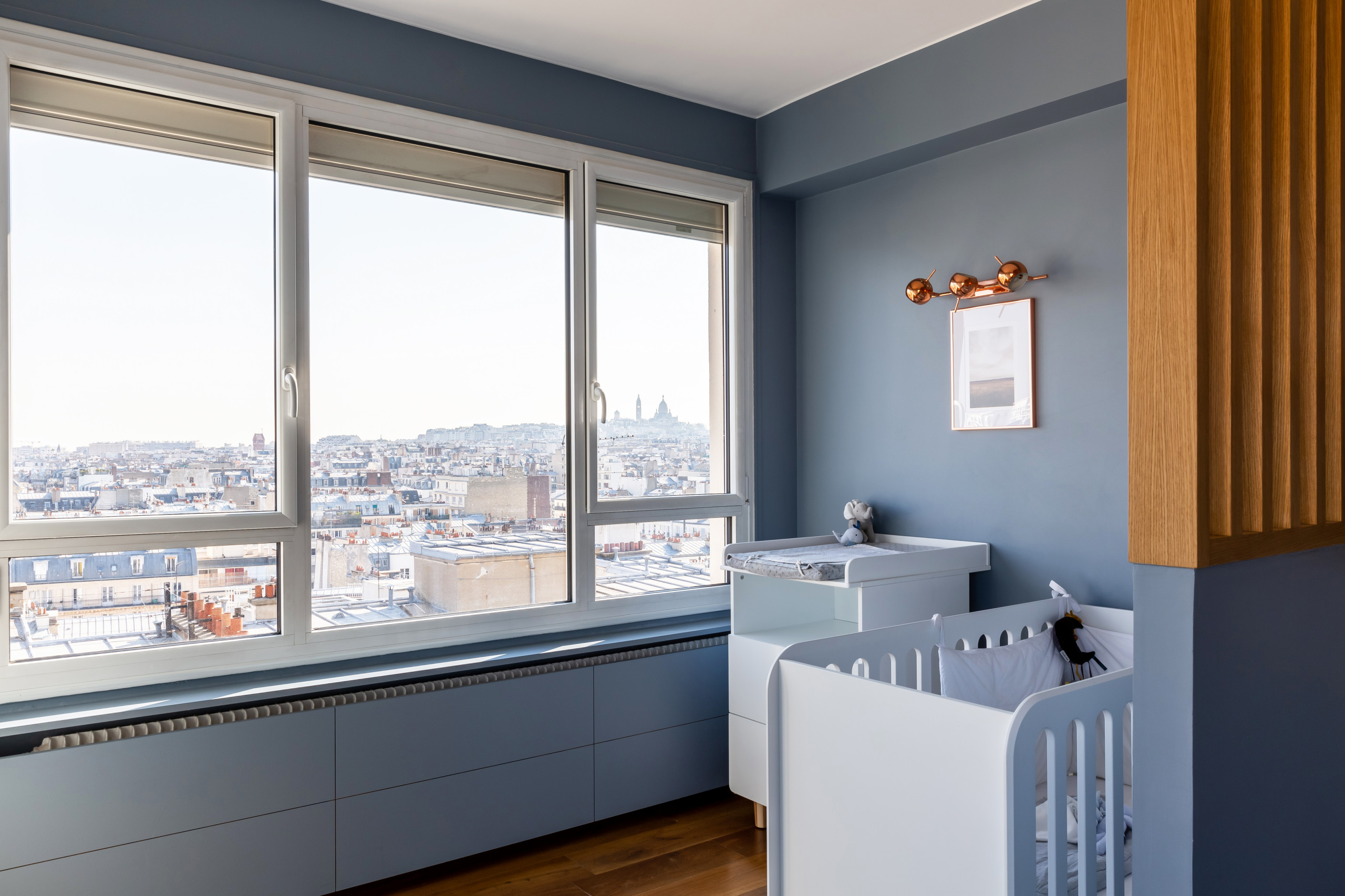 La chambre du bébé a été pensée comme un espace modulable. « Mes clients souhaitaient scinder l’espace nuit en deux, avec la chambre bébé à proprement parler et un second espace nuit avec convertible pour que la nounou puisse rester la nuit garder les enfants », explique Anne.