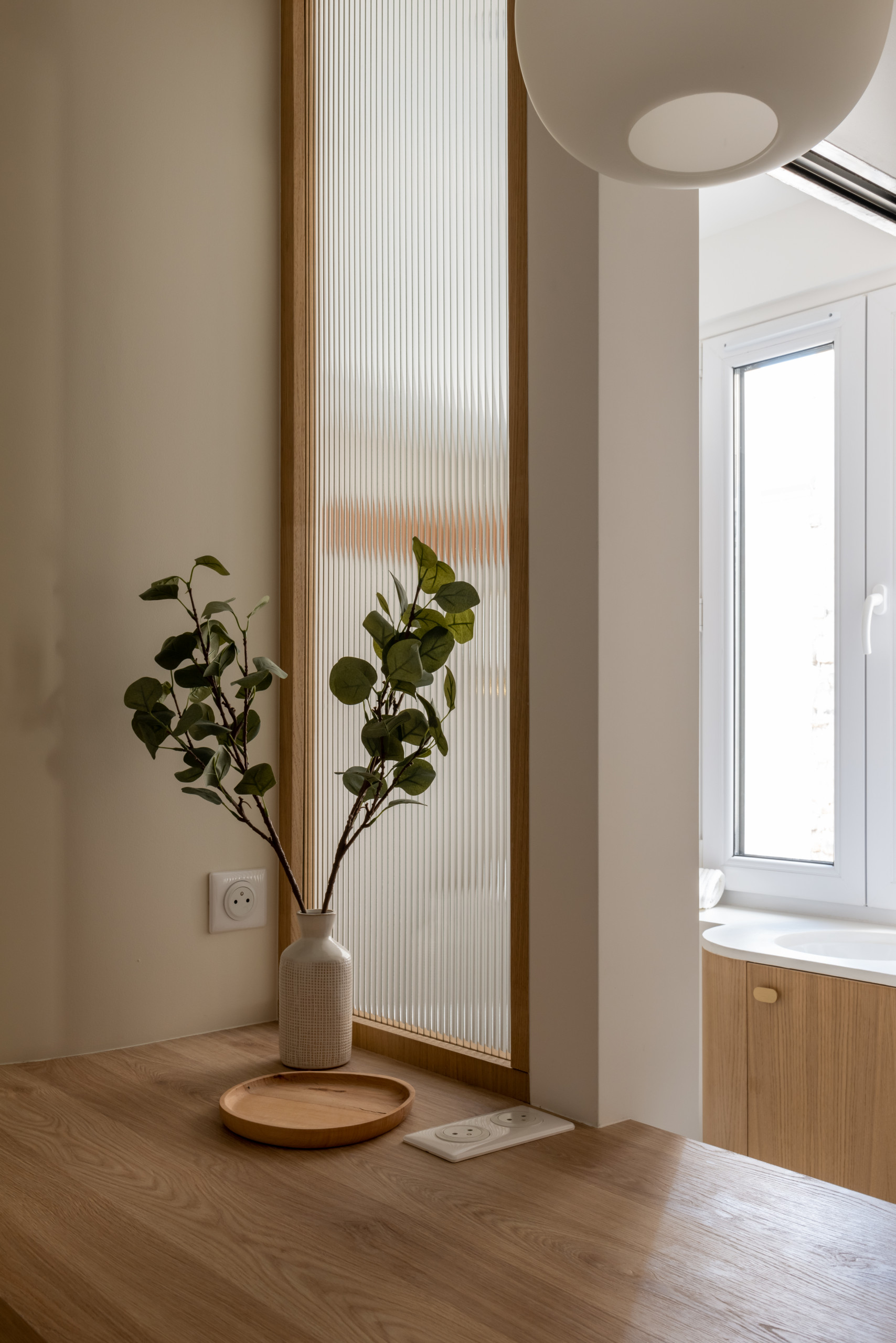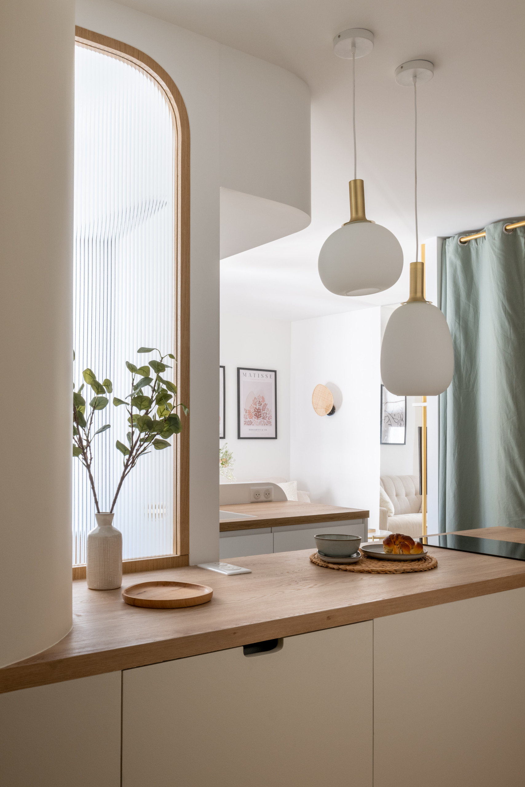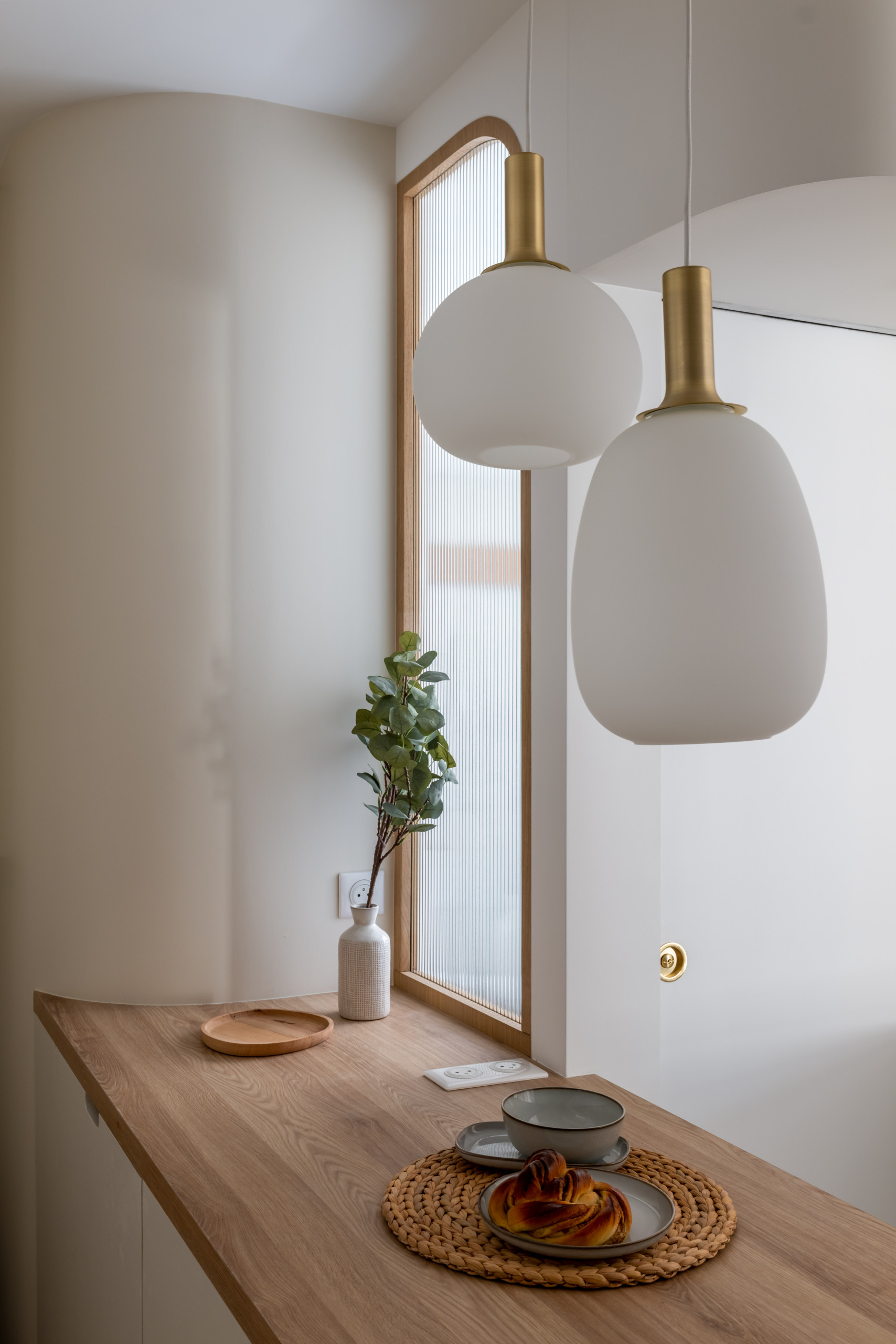 La configuration des fenêtres en angle peinait à rendre lumineuse la petite surface, aussi Alicia a-t-elle fait un gros travail de mise en lumière. Pour éclairer l’entrée, une élégante verrière en verre flûte et montants de chêne permet de profiter de la lumière de la salle d’eau en second jour. Le motif de l’arrondi a par ailleurs été décliné sur les lampes en opaline.