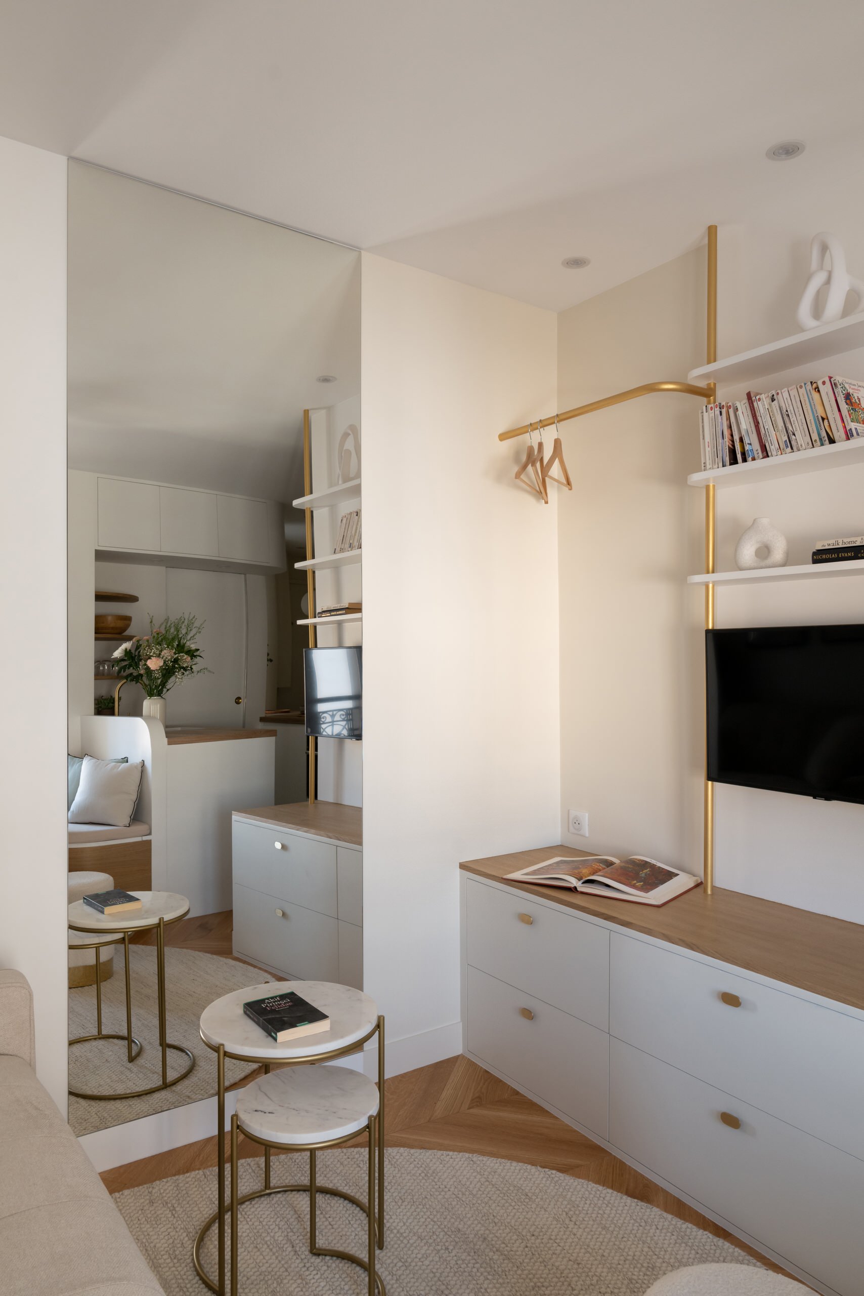 Après. On aurait pu envisager un nouveau dressing à cet endroit mais les propriétaires ne souhaitaient pas un tel volume de stockage pour les vêtements, n’étant en général sur place que pour une brève durée. Face au canapé, ils ont préféré un meuble multifonction tout en légèreté. Ce dernier a été réalisé sur mesure et accessoirisé esthétiquement avec des tubes en laiton. « C’est un gain d’espace quatre-en-un : à la fois bibliothèque, penderie, meuble TV et commode de rangements », détaille Alicia, qui l’a conçu pour être à la fois pratique et esthétique.