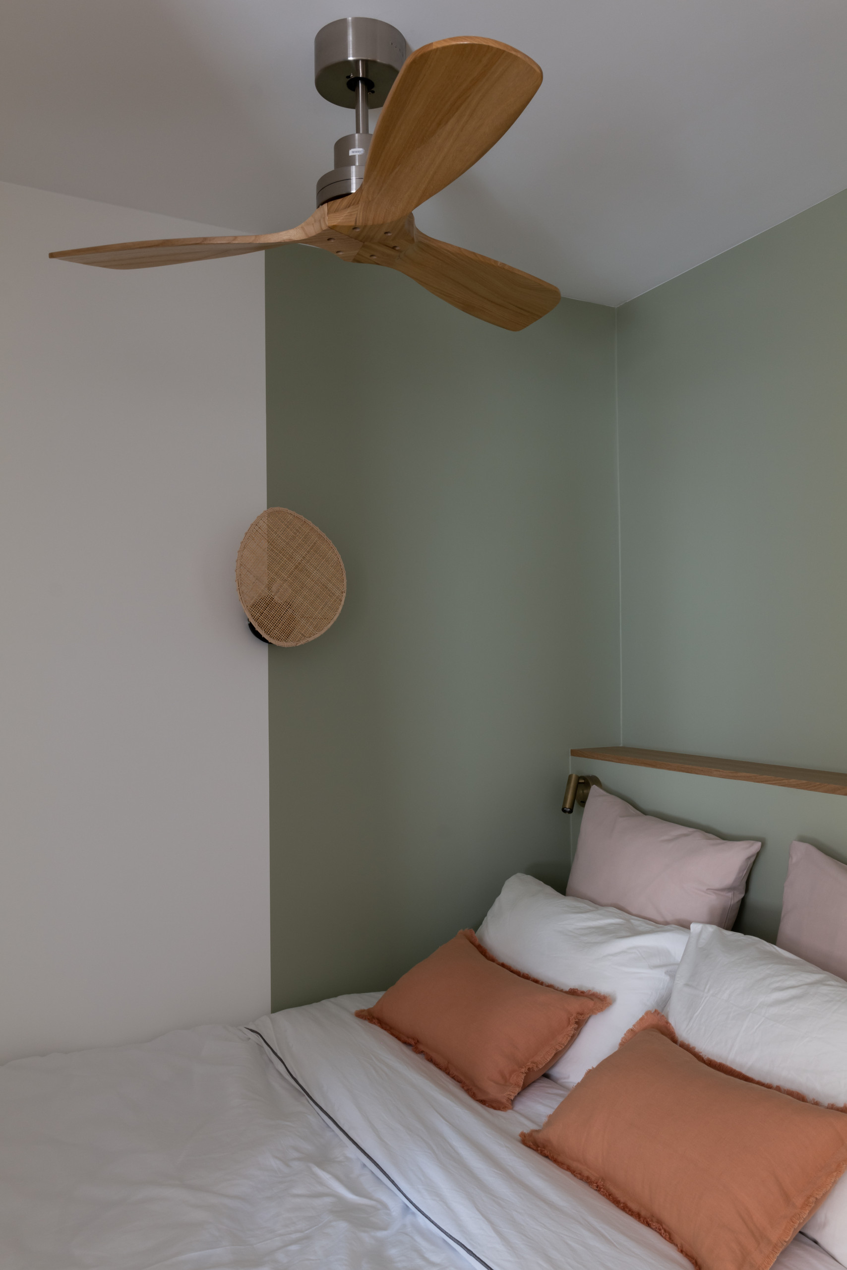 L’alcôve a été pensée comme un petit cocon de nuit, rehaussé par l’application d’une peinture verte côté tête de lit. « On a testé des couleurs plus pop au départ avant d’estimer que ce Vert de Terre de chez Farrow&Ball était vraiment apaisant et ressourçant », explique Alicia. Si la teinte n’a pas été apposée sur le pied du lit, c’est pour éventuellement pouvoir projeter un film à partir d’un vidéoprojecteur mobile.