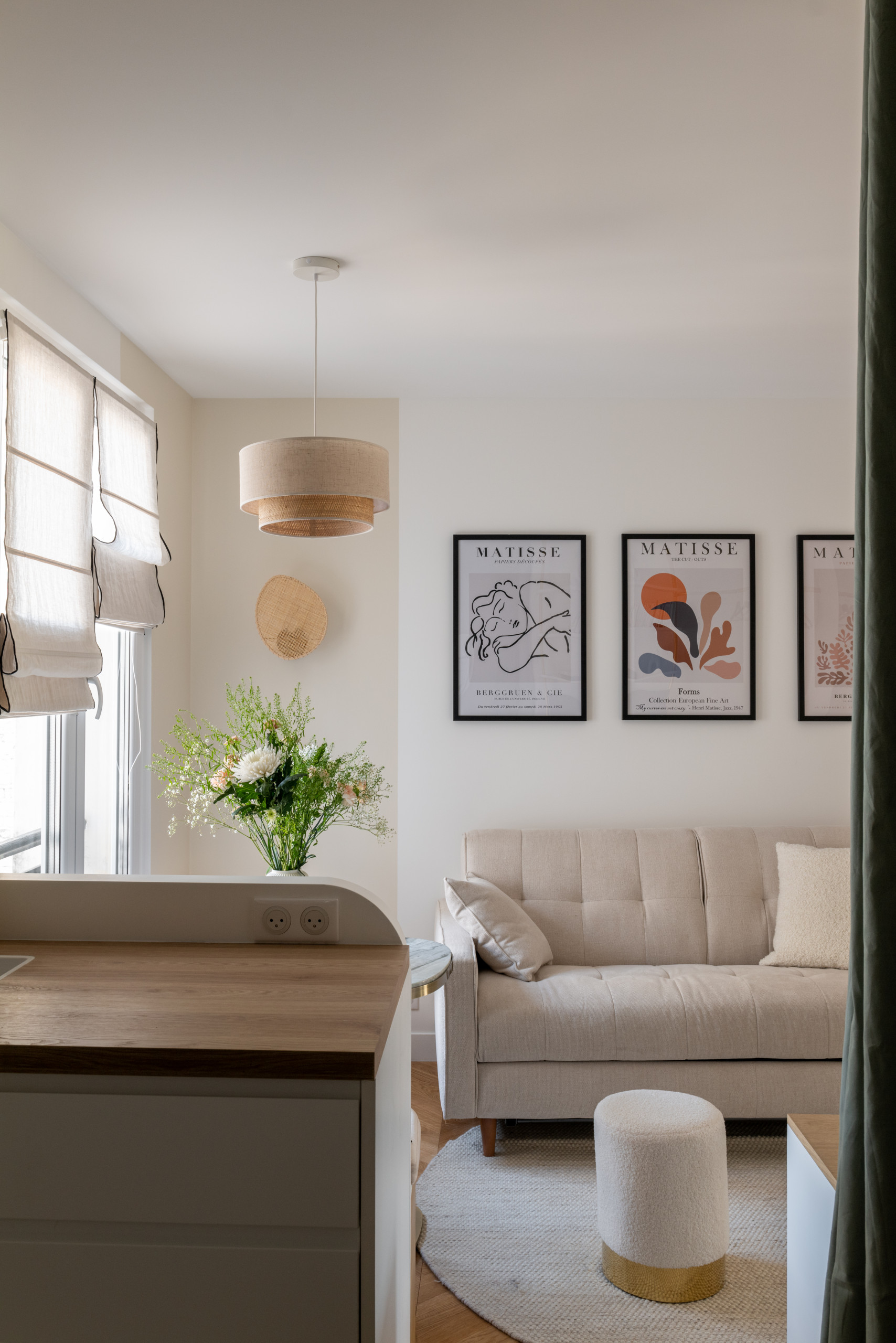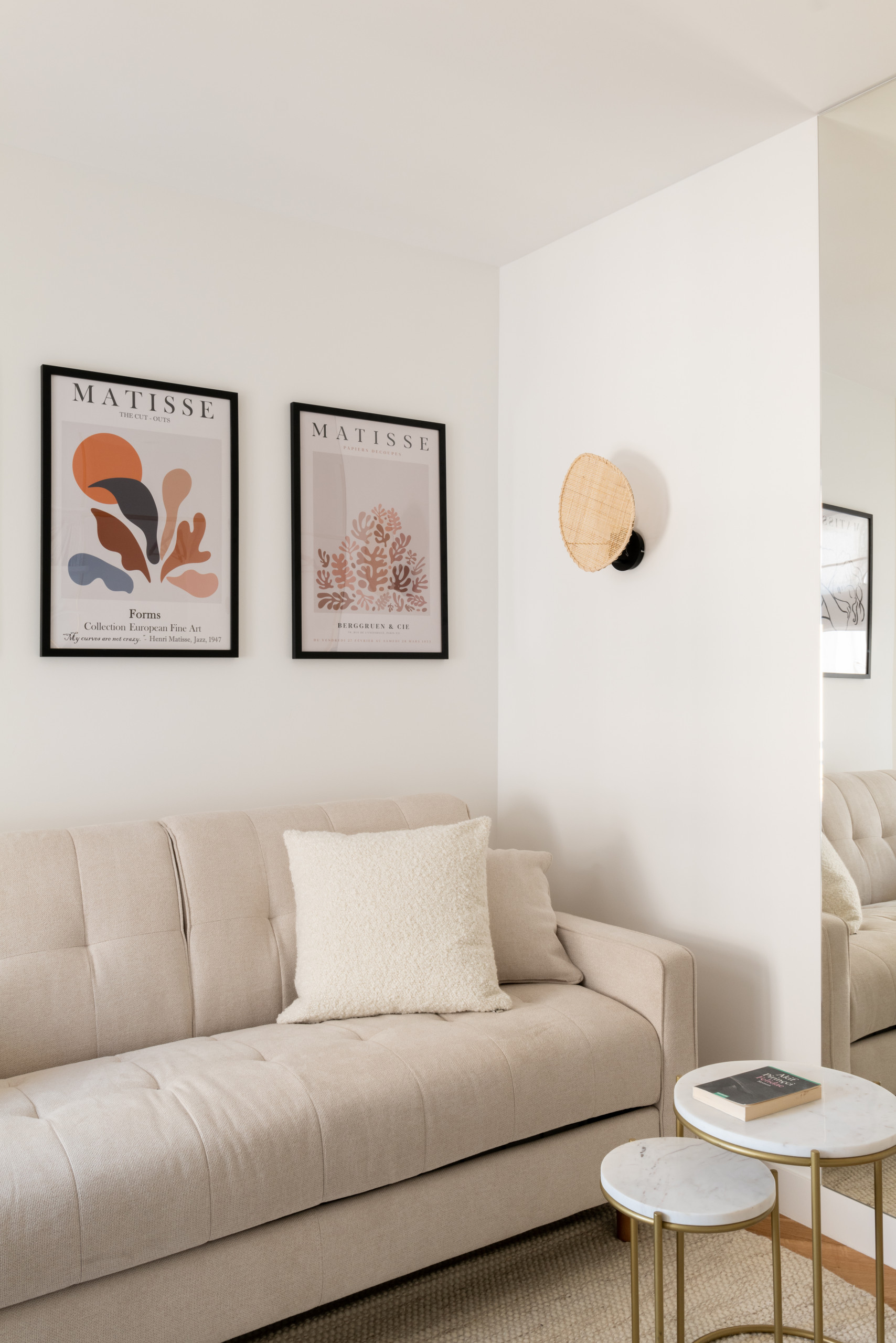 Les propriétaires ont choisi eux-mêmes ces trois encadrements de Matisse, le peintre français qu’ils préfèrent. Les appliques et la suspension, en matière naturelle, apportent une petite touche bohème qui compense le côté plus chic du canapé capitonné. Dans le coin séjour, l’architecte d’intérieur a suggéré d’installer un miroir toute hauteur. « Face à la fenêtre, il ramène la lumière en fond de pièce et sert aussi de miroir en pied, ce qui est toujours pratique. C’est une astuce dont je me sers souvent », partage-t-elle.