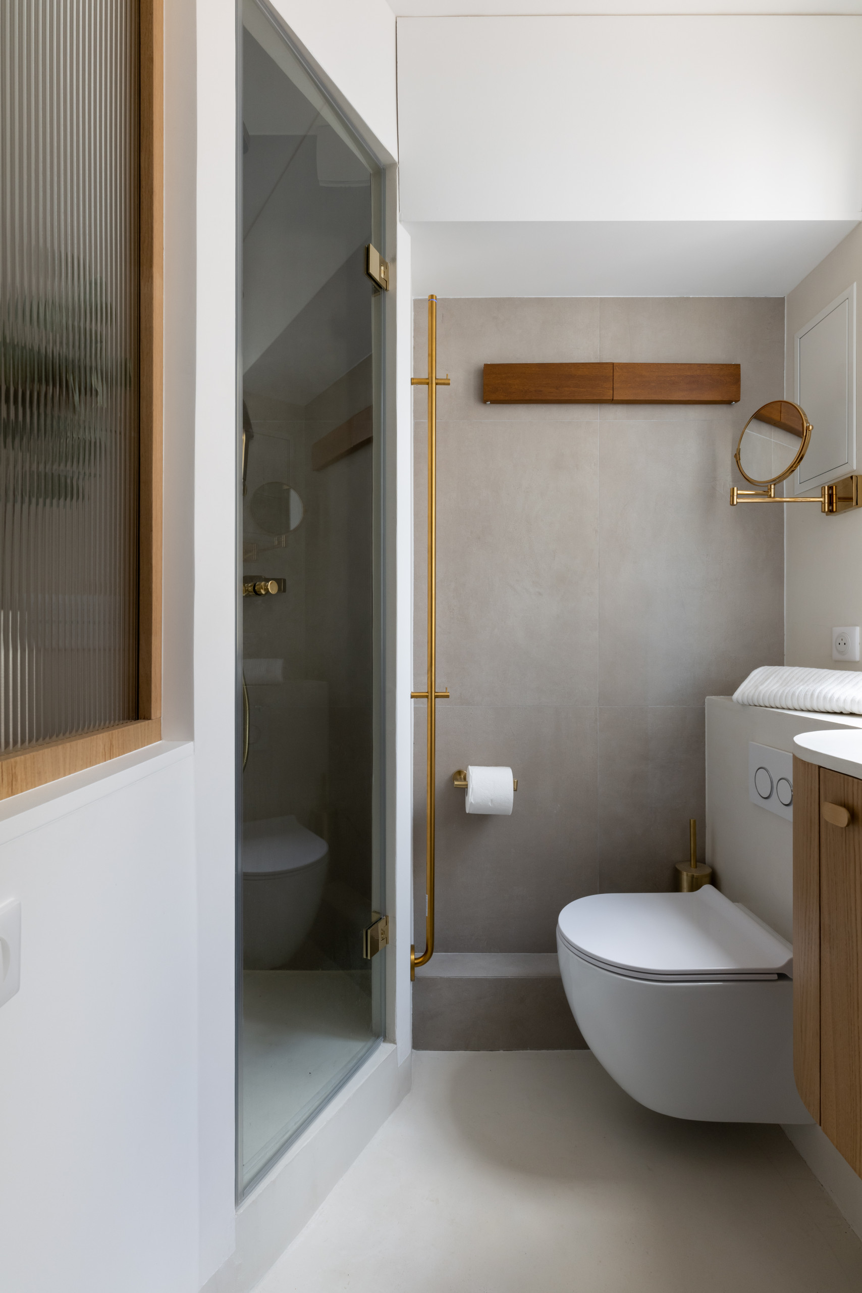 Après. La nouvelle salle de bains est très confortable pour un si petit studio. L’alcôve de douche, les toilettes suspendues ou encore le meuble vasque, créé sur mesure avec un bel arrondi, offrent toutes les fonctions nécessaires. L’impression haut de gamme est véhiculée par une utilisation de matières naturelles comme le béton ciré, le chêne ou encore le laiton. « C’était un vrai parti-pris de mes clients qui étaient en attente de raffinement et d’élégance », rappelle Alicia.