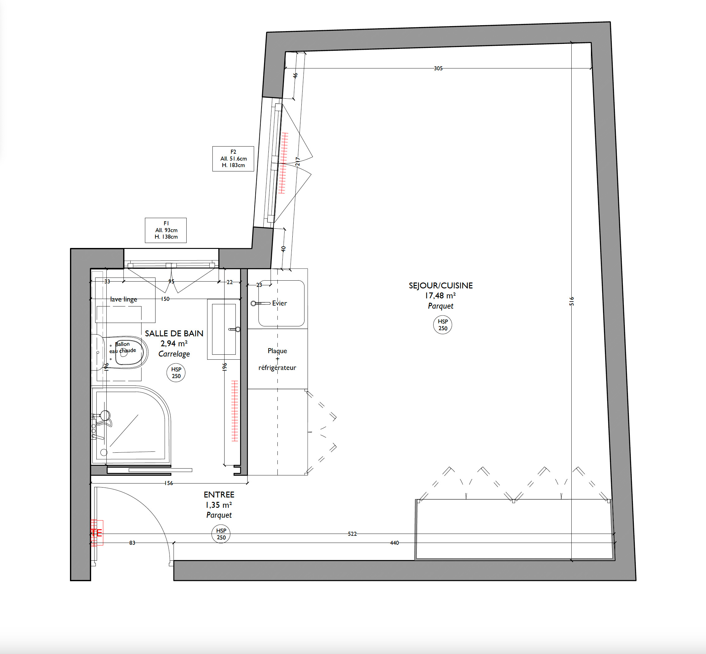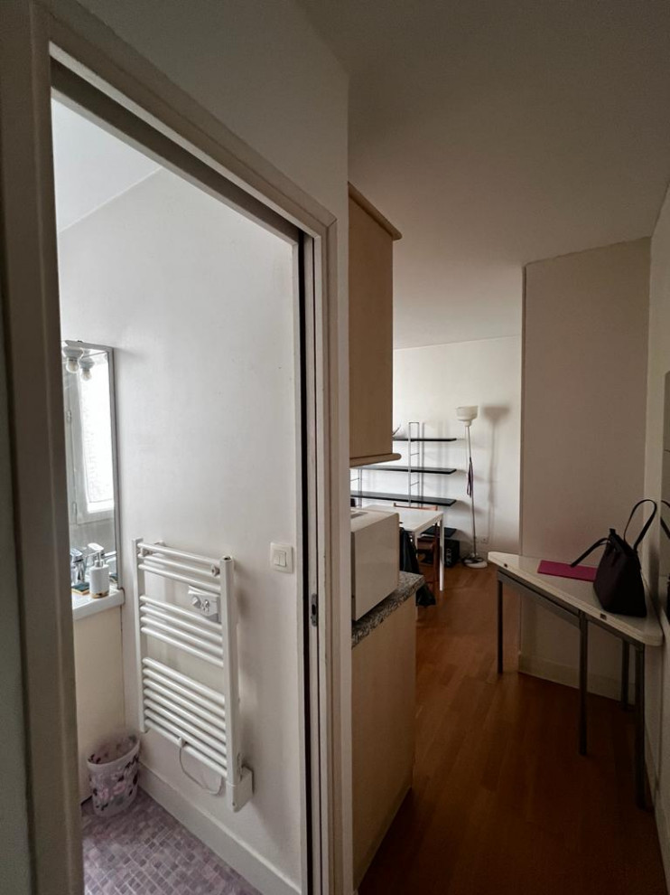 Avant. Au cinquième étage sur cour d’un immeuble de faubourg, la petite surface de 22 m² avait été aménagée précédemment dans les années 1980. Sa configuration était en L inversé et ses principales contraintes résidaient dans deux fenêtres réparties sur les petits côtés du L, ainsi que dans ses pièces d’eau (et donc ses évacuations) massées à l’entrée. « Ce n’était vraiment pas simple. Ces deux éléments figeaient l’espace et nous ne pouvions guère chambouler le plan… », partage Alicia Oustry.