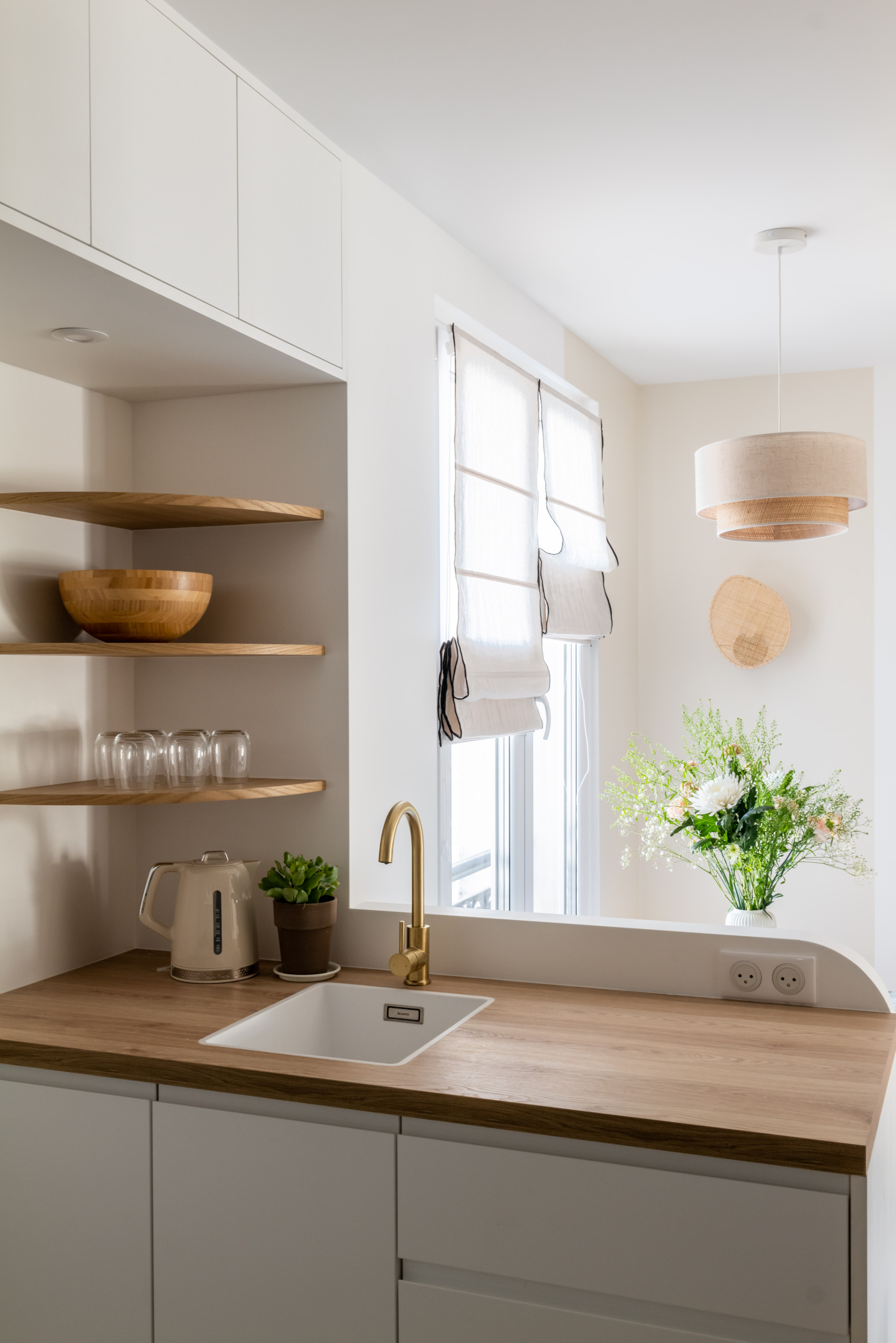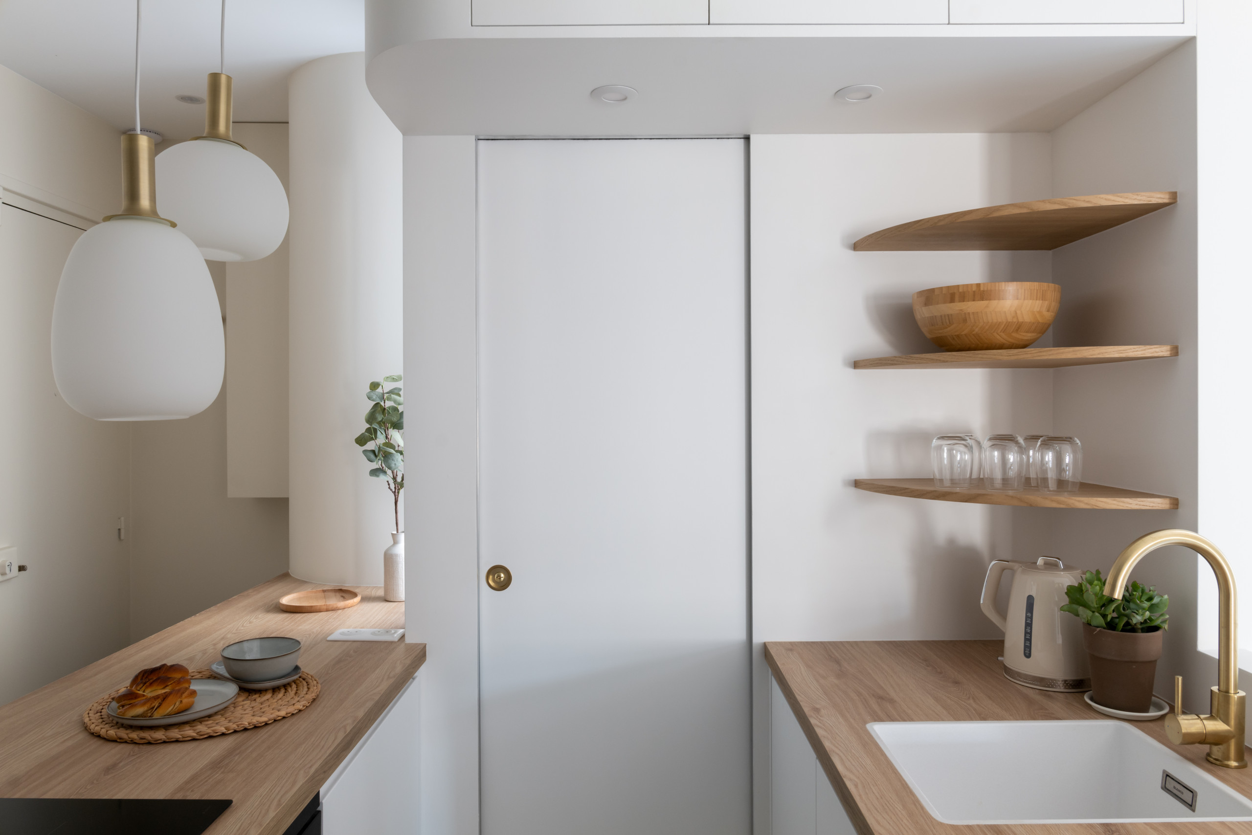 Des rangements complémentaires ont été aménagés en partie haute de la cuisine, sous la forme d’esthétiques étagères cintrées et de quelques caissons bien intégrés au-dessus du passage de porte de la salle d’eau.