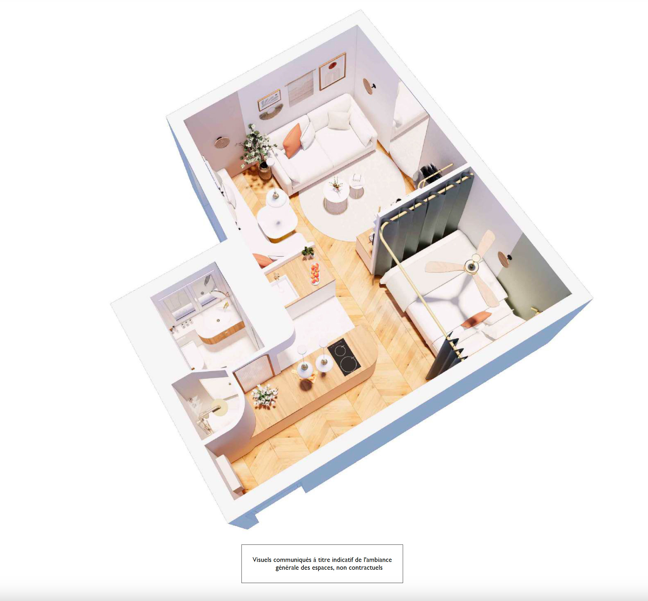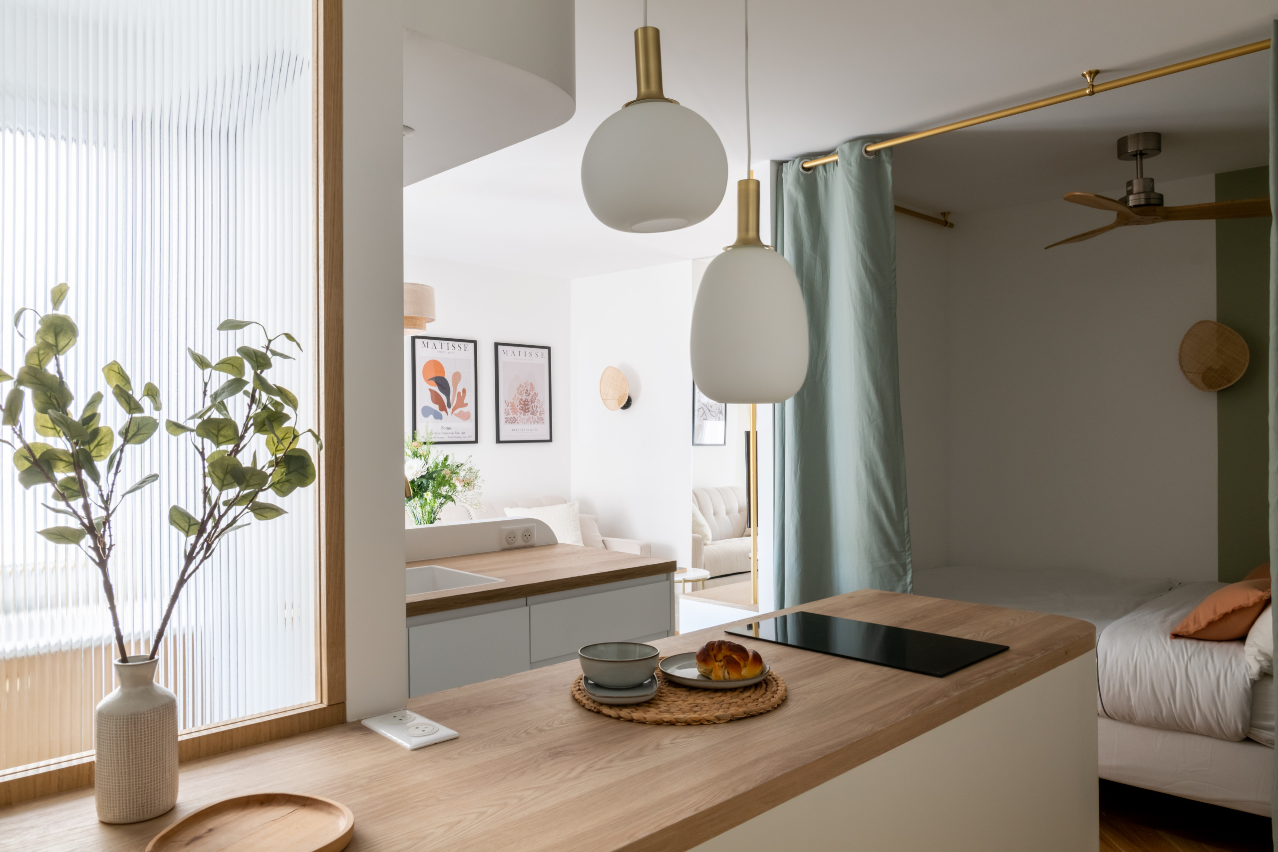 Après. La situation s’est encore compliquée lorsque les propriétaires ont exprimé toutes leurs exigences : « Ils tenaient à inclure tous les équipements que l’on trouve dans un appartement beaucoup plus grand : un programme électroménager complet avec lave-linge et lave-vaisselle, un espace nuit indépendant et un canapé convertible pour que quatre personnes puissent dormir. Ce type de demande est d’ailleurs de plus en plus fréquent, les clients souhaitant toujours plus de fonctionnalités dans des espaces de plus en plus restreints », explique Alicia. Il a donc fallu faire tout simplement des miracles pour tout caser !