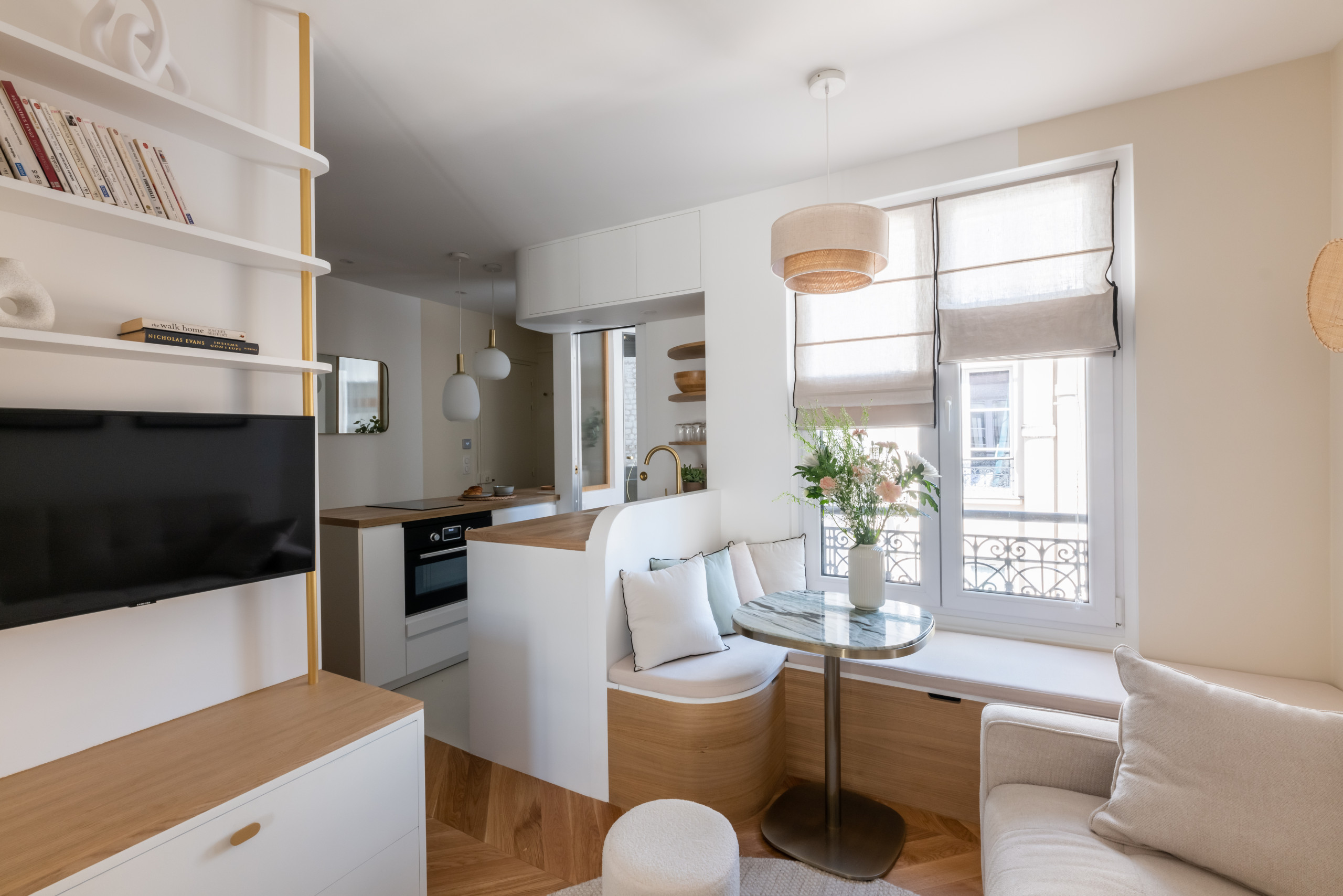 Une banquette en bois cintré optimise l’espace, offrant un généreux espace de stockage dans son coffre. « Nous l’avons installée à la place du radiateur électrique existant. Dans les petites surfaces, je préconise d’installer du chauffage au sol électrique pour délester au maximum les murs », conseille l’architecte d’intérieur. La banquette a un autre tour dans son sac : elle sert aux propriétaires à enfermer leurs affaires personnelles en cas de location de l’appartement. « Nous l’avons équipée d’une serrure magnétique, imperceptible de l’extérieur, qui se déverrouille avec une carte », explique-t-elle.
