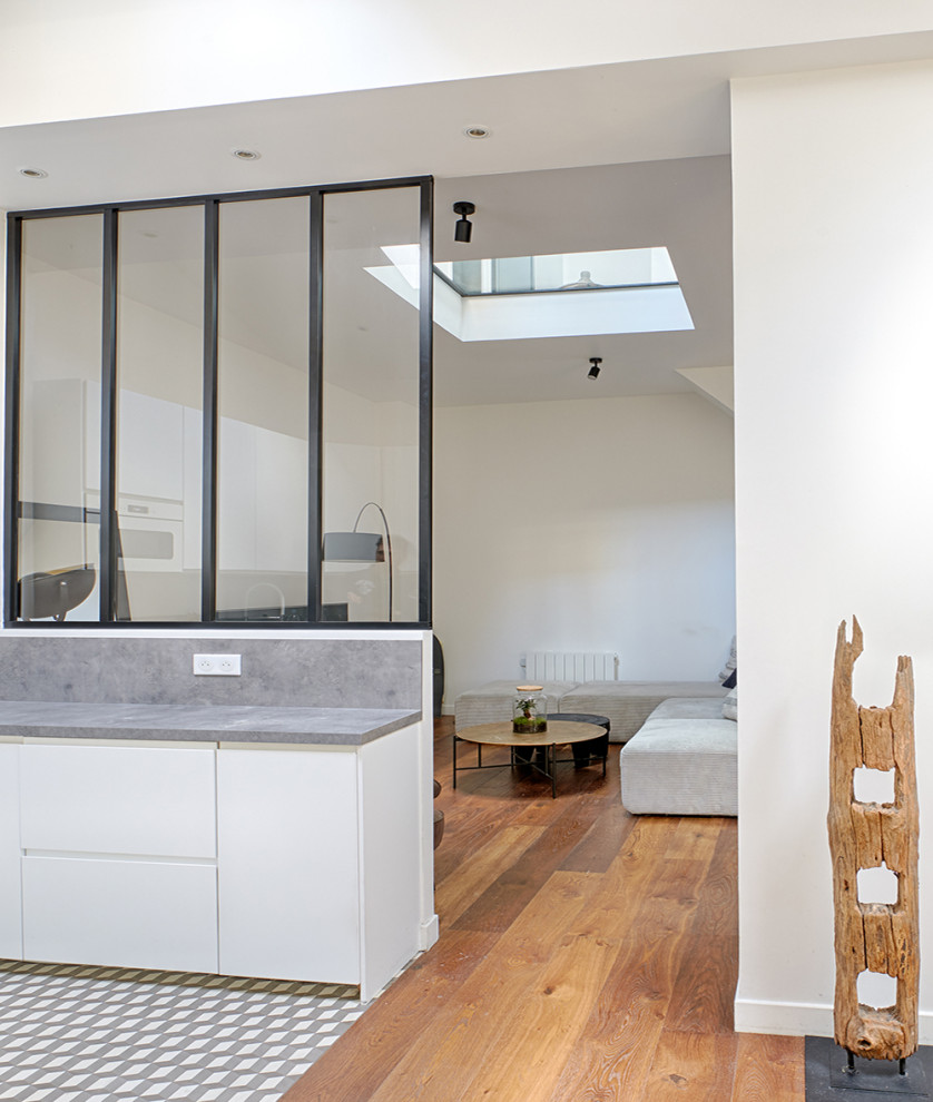 En proche banlieue sud-est de Paris, à Maisons-Alfort, nous traversons la cour arborée d’un immeuble début de siècle de quatre étages avant de pénétrer dans la maisonnette. Une vaste pièce de vie typée loft nous accueille par la cuisine donnant sur une belle terrasse. « C’est elle qui a fait craquer les propriétaires à l’achat ! », nous souffle Tina Merkes, l’ingénieur architecte en charge du projet. À l’arrière, le salon, dessert une chambre tandis que l’escalier en acier permet de gagner l’étage.