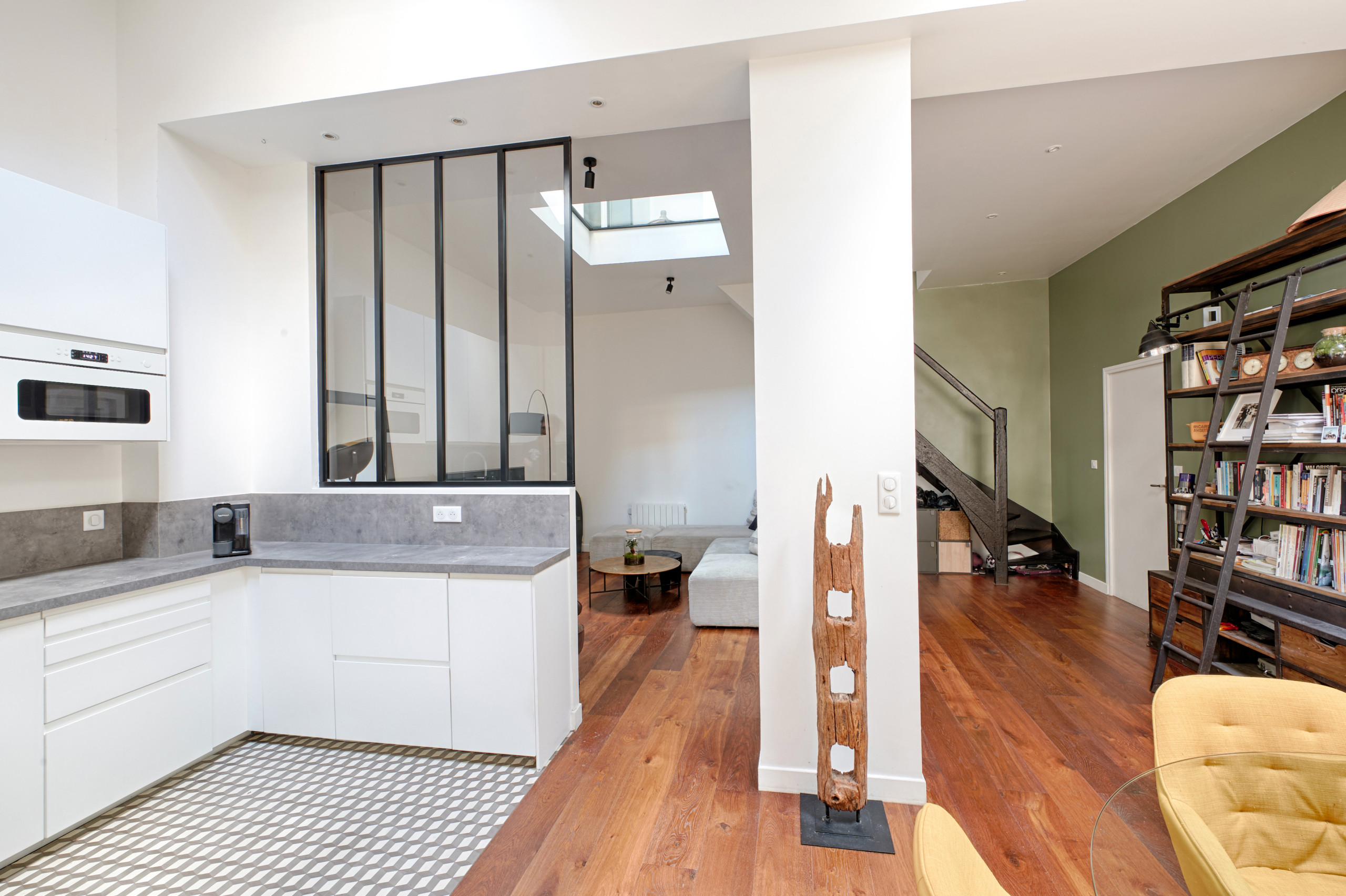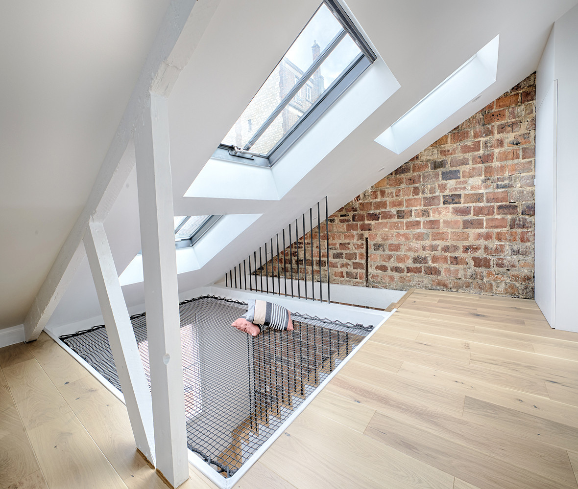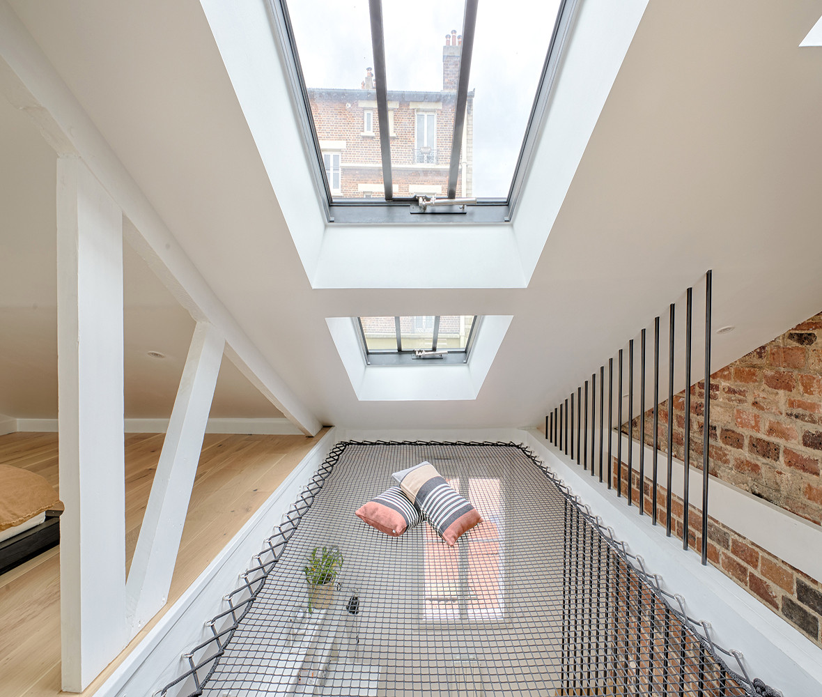 Outre le Velux déjà en place, un autre Velux et deux verrières de toit type atelier de chez Cast PMR ont apporté de la lumière à la zone, et bien au-delà, puisque les deux étages en dessous ont profité de l’opération.
