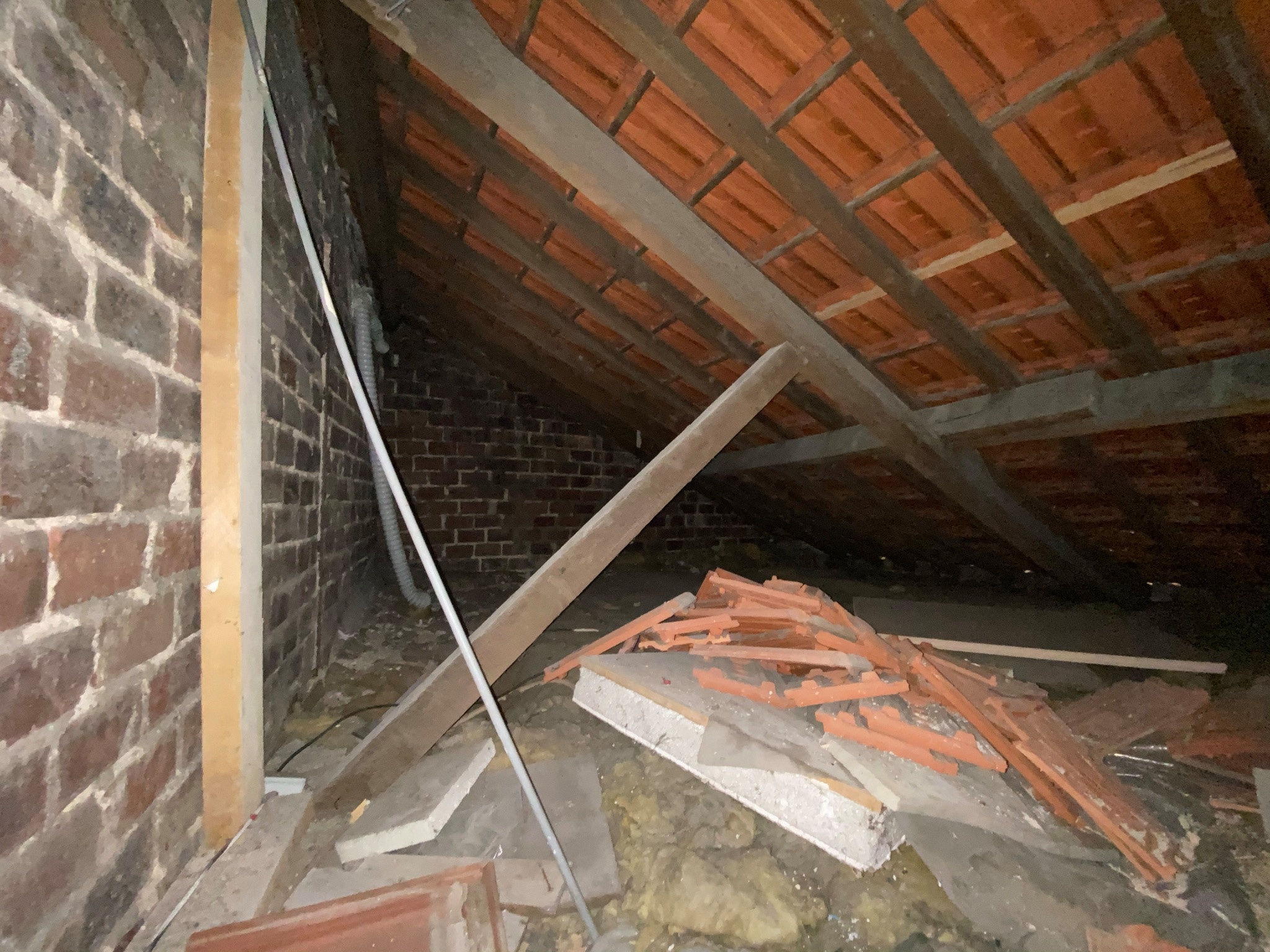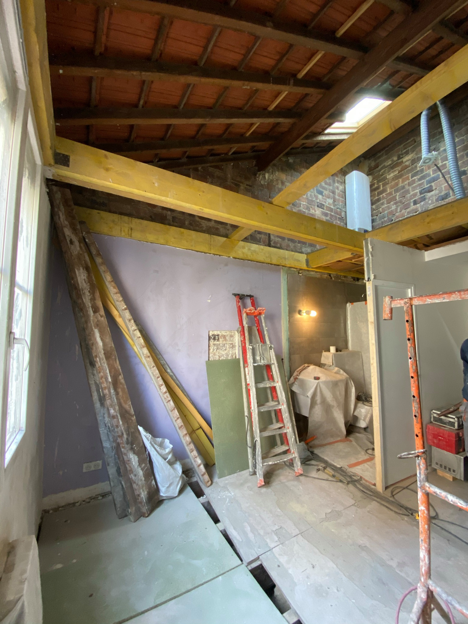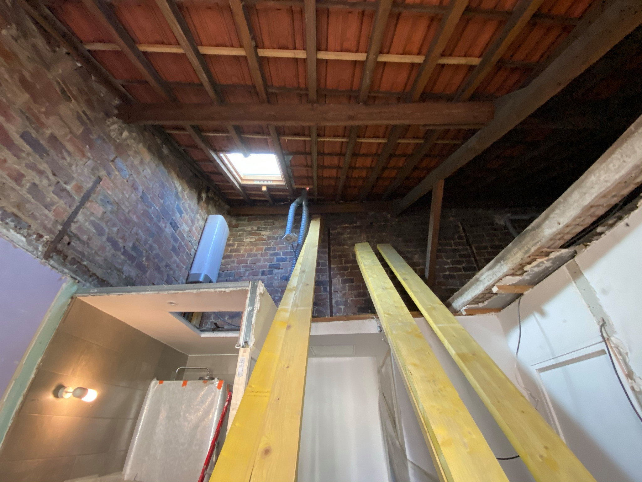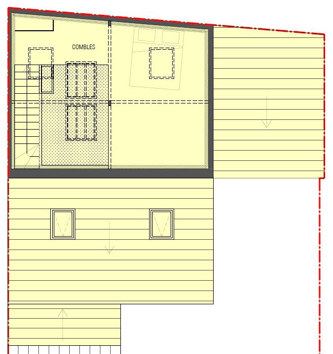 Nous gagnons à présent l’étage des combles. Les combles de 26 m² au sol étaient perdus, occupés uniquement par un Velux ancien et un chauffe-eau.