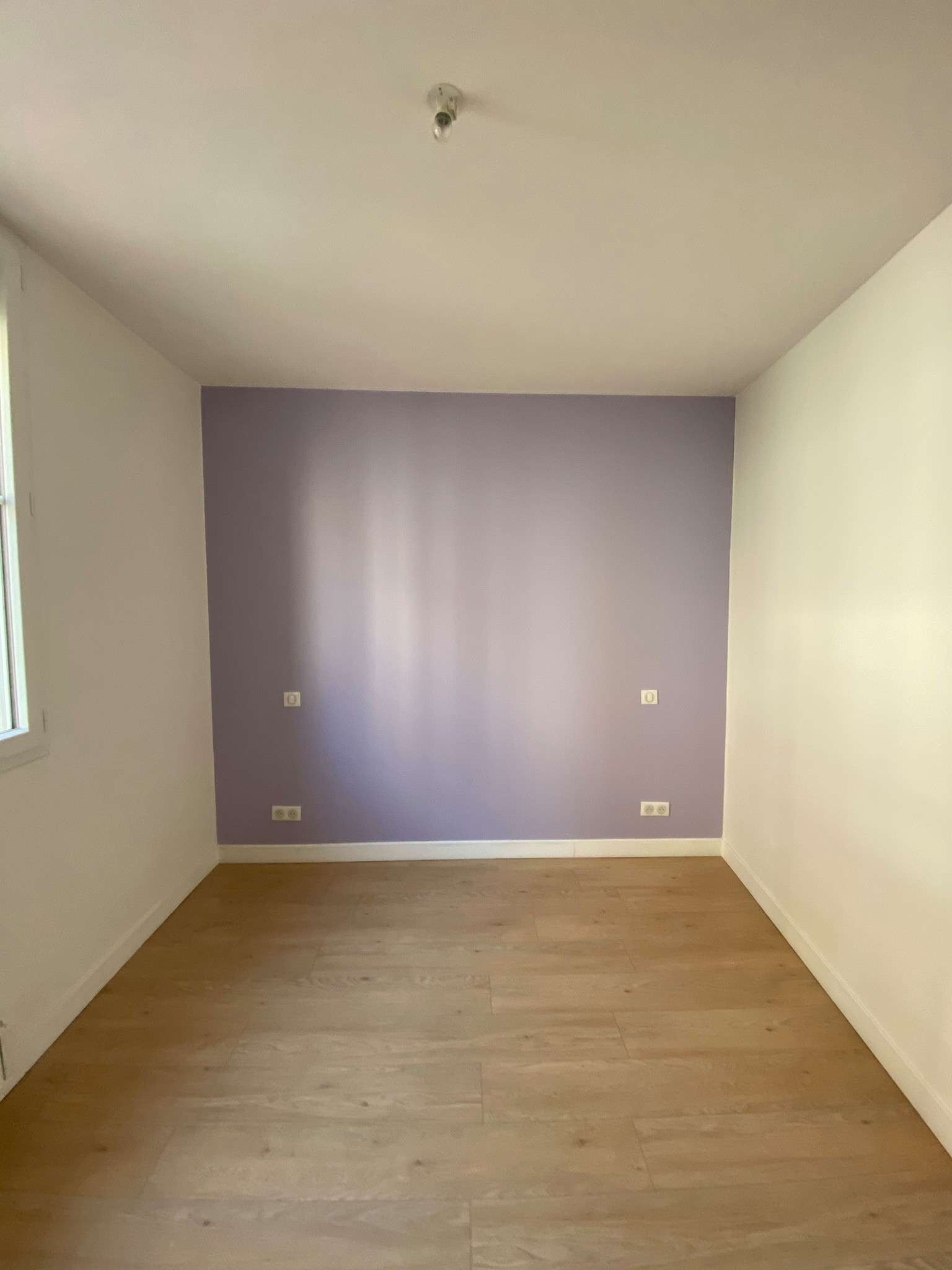 Avant. Voici la chambre 1 avant travaux. Le mur violet, plaqué, correspond maintenant au mur de briques. La cloison de droite de la chambre a été abattue. Il ne reste plus qu’une chambre fermée à l’étage. Celle-ci, dont nous n’avons pas de visuel, n’a pas été modifiée.