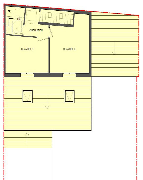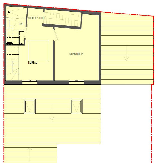 La salle de bains a été agrandie et la chambre 1 transformée. Elle est devenue un bureau traversant, avec escalier, afin de permettre la montée vers le dernier étage.