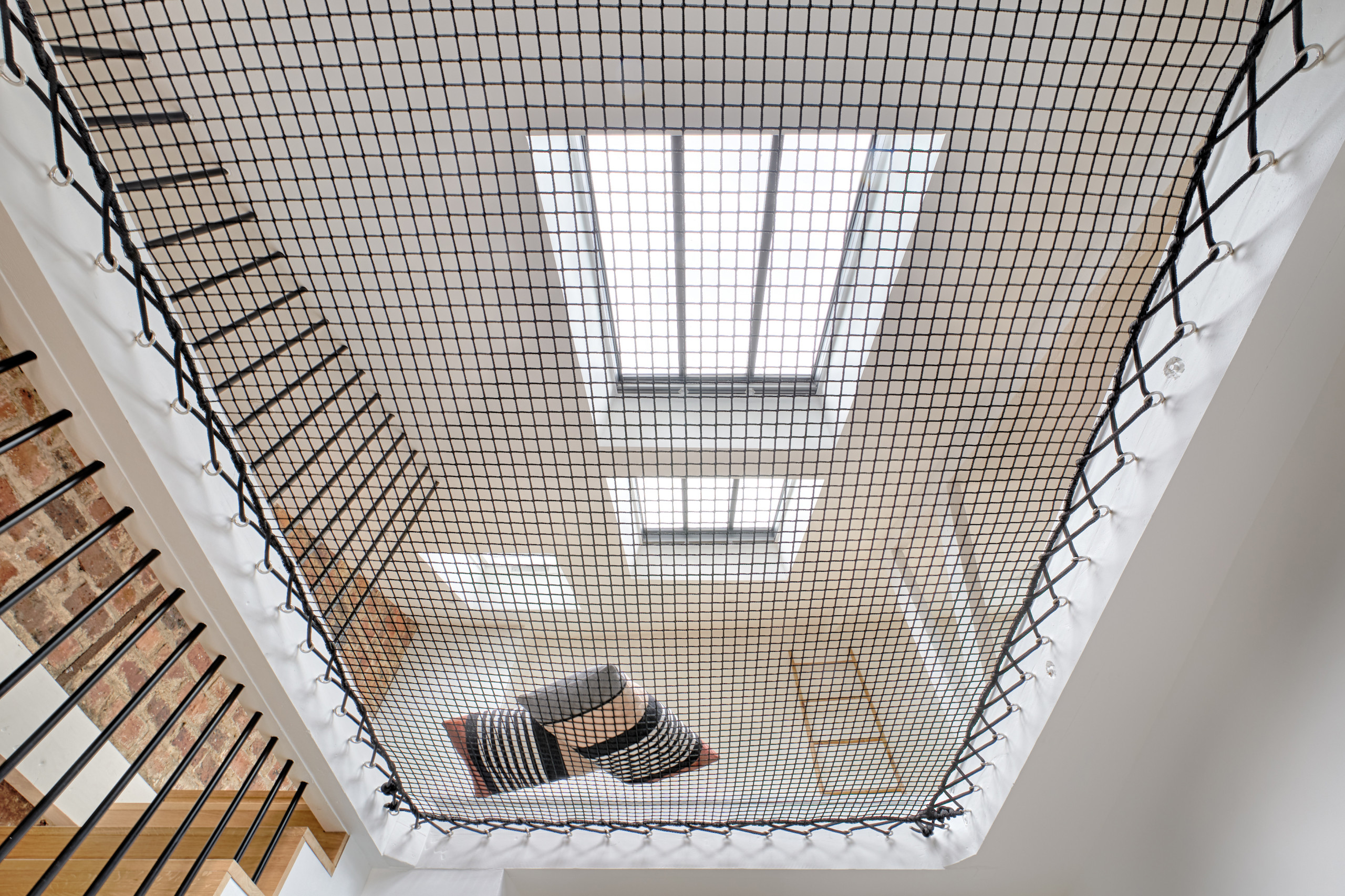 Pour diffuser largement la lumière vers le centre du logement, le filet de 2,10 x 3,25 m (6,8 m²) a été installé juste sous les deux verrières. Il a été commandé chez Loftnets et installé par la société de travaux sur un cadre de poutres en bois solidement arrimées aux porteurs à l’aide de 80 pitons en Inox.
