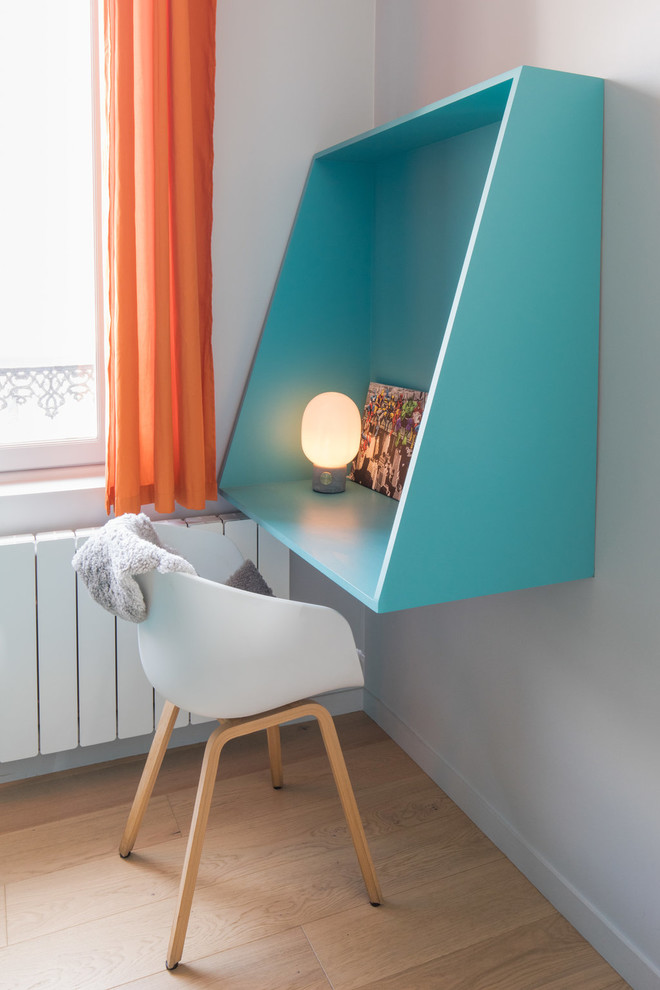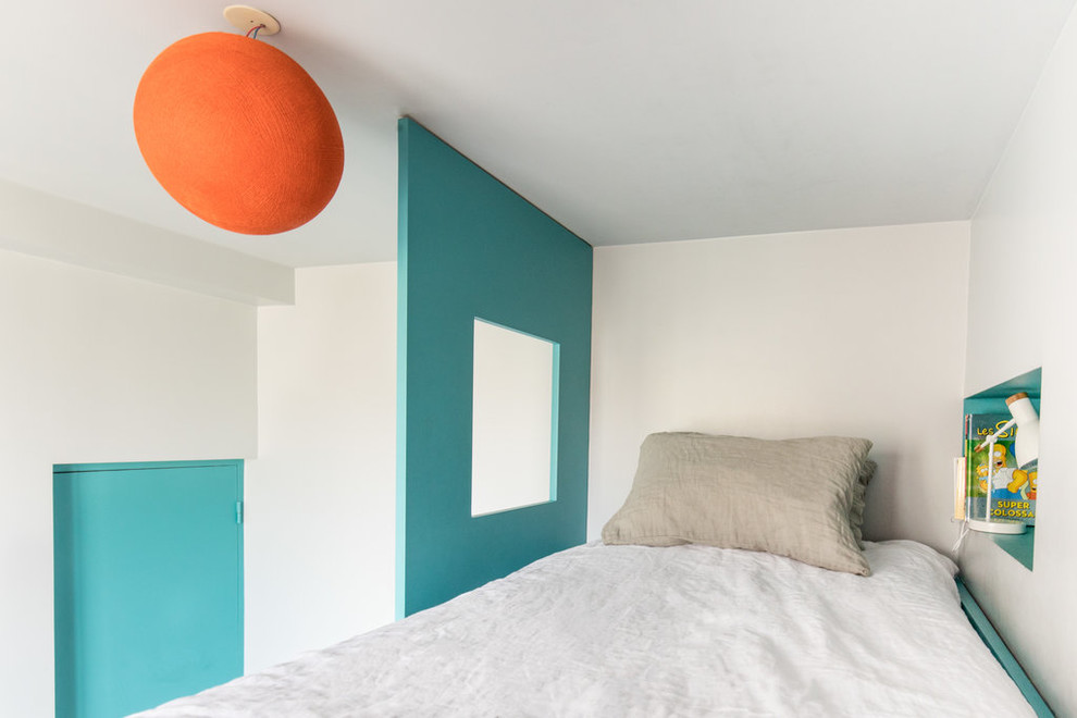 « Afin d’optimiser l’espace restreint de la chambre nous avons fait en sorte d’utiliser la pleine hauteur sous plafond pour créer un lit mezzanine avec en dessous un coin jeux vidéo/lecture telle une cabane et, sur la gauche, des placards et tiroirs. Cette structure ludique forme trois niveaux de briques qui s’abaissent peu à peu vers la fenêtre », détaille Stéphanie.