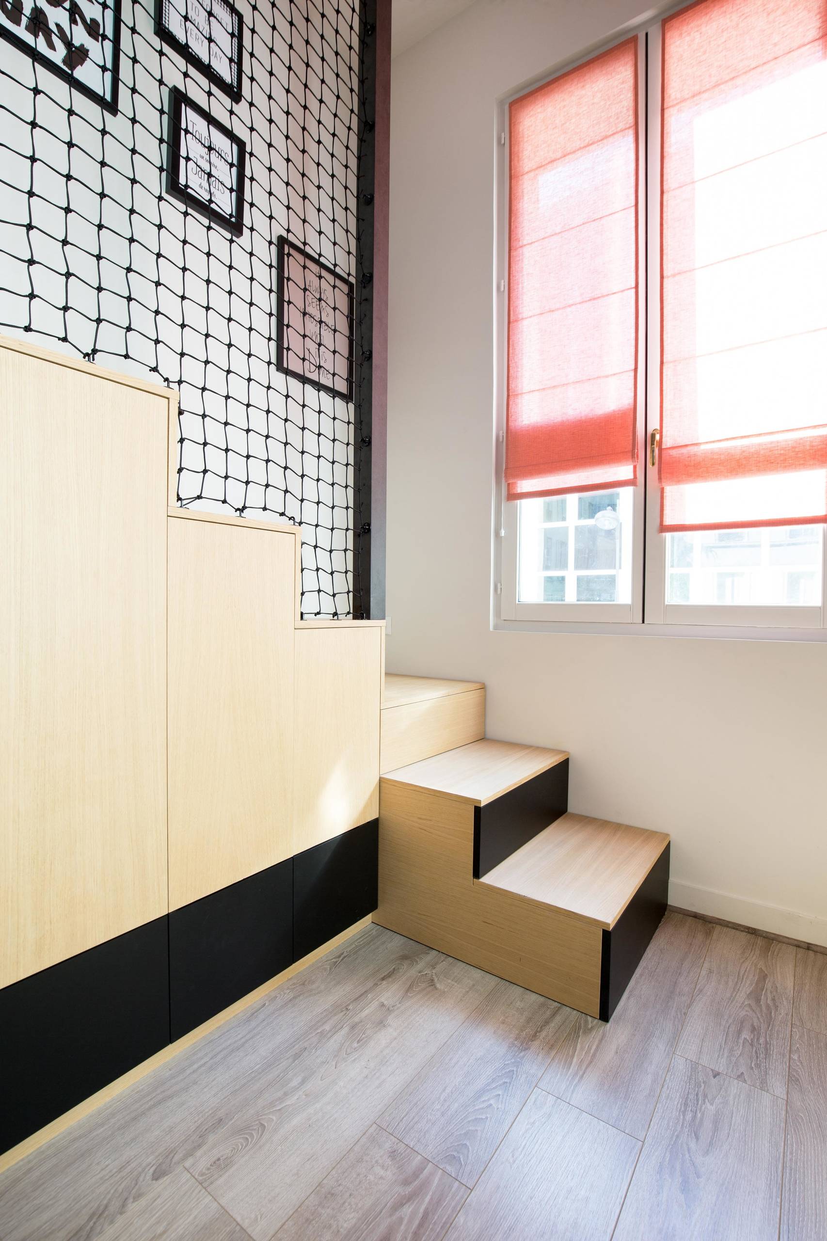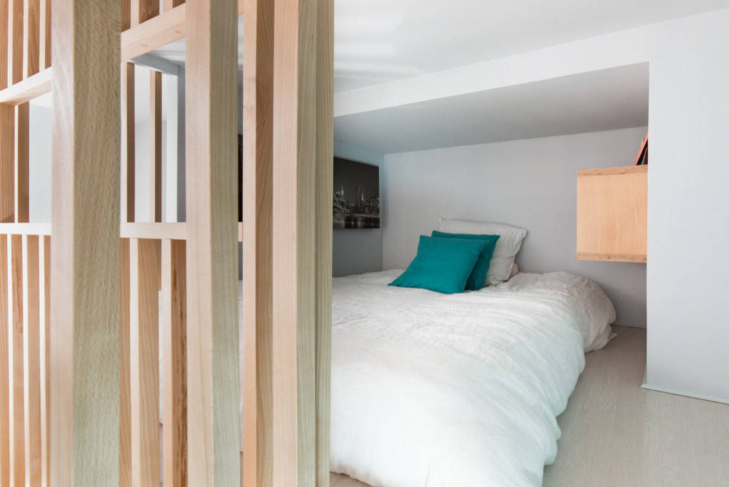 « Nous avons réussi à créer plusieurs univers sur une petite surface avec une circulation fluide : bureau, coin détente et espace nuit. Les menuiseries sur mesure offrent de nombreux rangements et l’originalité et la transparence sont de mise grâce à l’installation de filets comme garde-corps », résume Stéphanie.