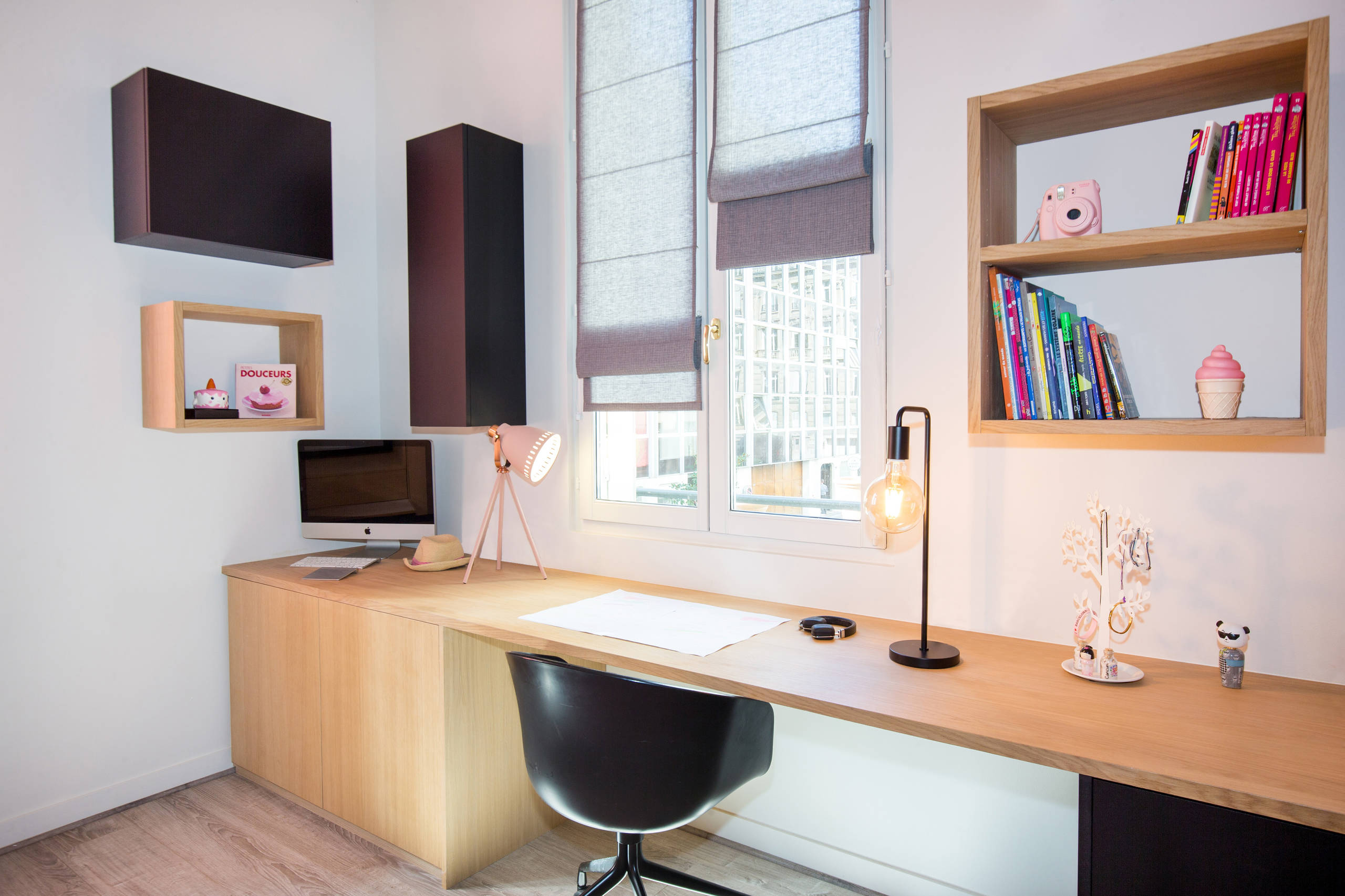 « Les propriétaires étaient très à l’écoute de leur fille. Ils m’ont demandé une ambiance originale avec de la personnalité. La jeune fille souhaitait un décor gai, propice à écouter de la musique, jouer aux jeux vidéo et recevoir ses copines. Ses parents ont insisté sur trois besoins : un grand bureau pour travailler, beaucoup de rangements et un lit supplémentaire pour accueillir la grand-mère des filles », détaille la professionnelle.