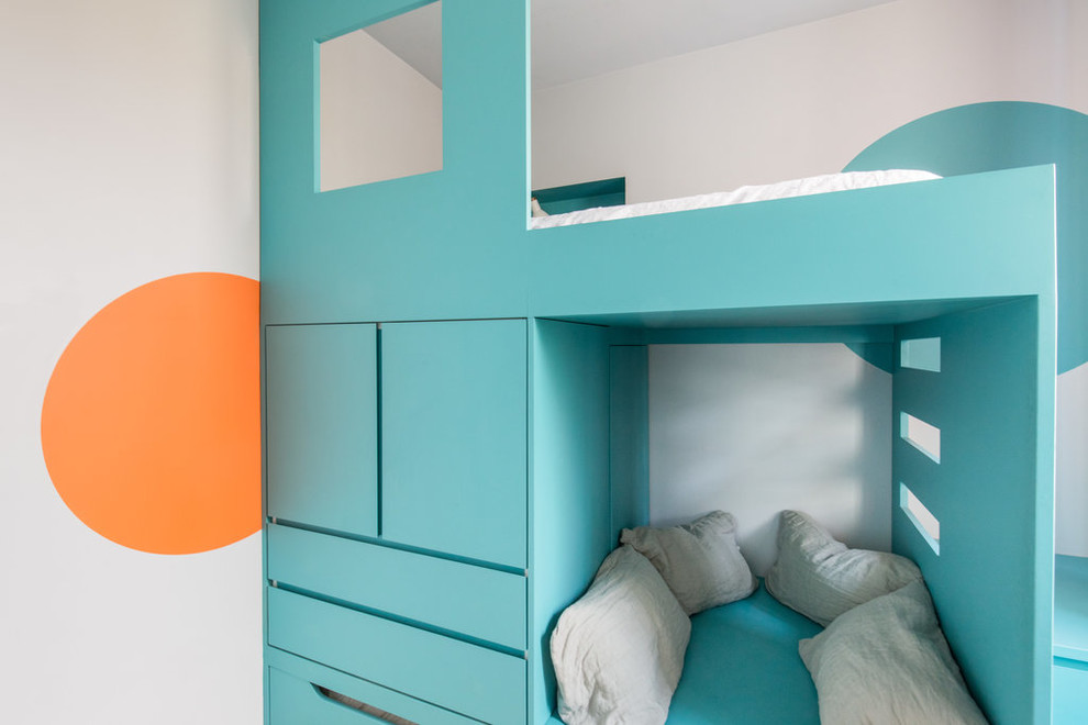 Autres plus du projet : un petit « bureau box » fabriqué sur mesure prend moins de place qu’un vrai bureau tout en perpétuant l’esprit ludique souhaité. Un lit gigogne placé sous le coin jeux vidéo/lecture permet au garçon d’inviter un copain à dormir. Enfin, on note les découpes en pied de lit pour éclairer le coin cabane tout en servant d’échelle. En outre, une partie ajourée dans le garde-corps crée une fenêtre et agrandit les perspectives lorsque que le jeune garçon se trouve dans son lit.