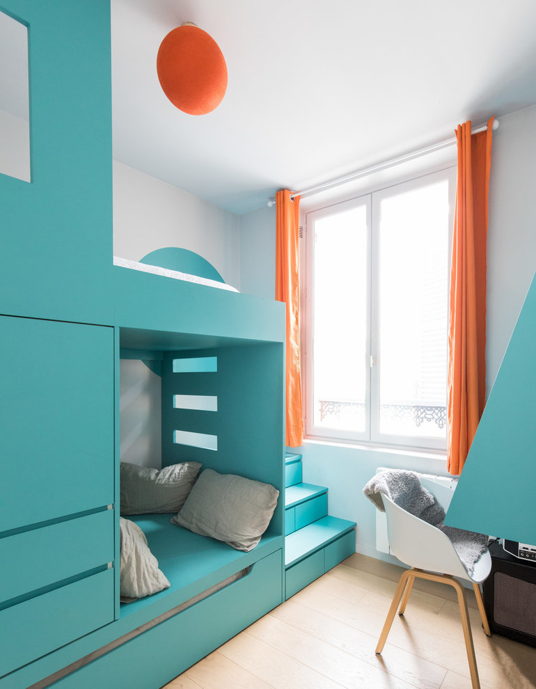 Dans le cadre de la rénovation totale d’un appartement de 70 m² pour une famille de mélomanes, voici la nouvelle chambre du petit garçon.