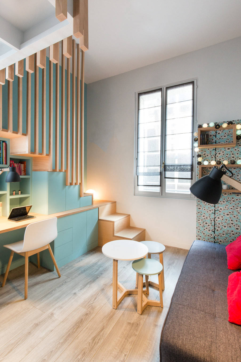 Afin d’offrir une atmosphère apaisante à la jeune fille, Stéphanie est partie sur une alliance de bleu doux et de bois clair qui lui a beaucoup plu à. Grâce à des tasseaux en sapin, elle a imaginé un garde-corps sécurisé pour le lit de 140 en mezzanine : « Graphique comme un claustra, il permet de laisser passer la lumière. Afin que la jeune fille ne se sente pas enfermée, nous avons créé une fenêtre en bandeau par laquelle elle peut voir la cour, d’où le nom que nous avons donné au projet : “Fenêtre sur cour” », explique la pro.