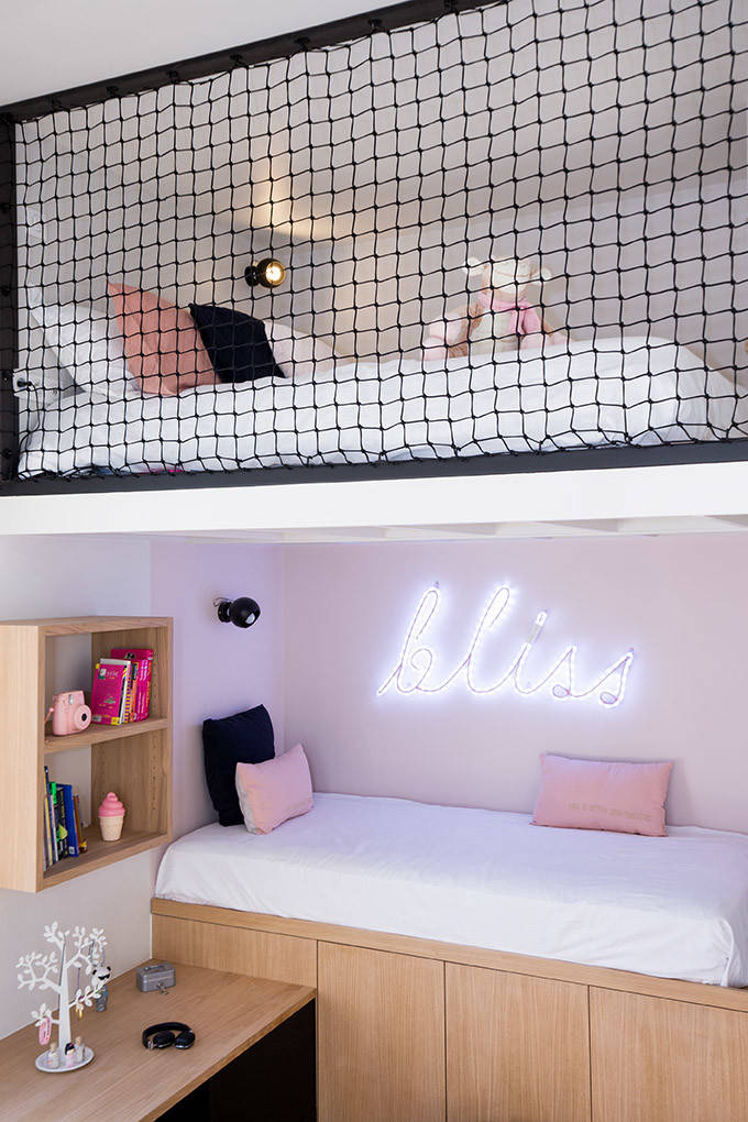Pour une adolescente en quête de quiétude et d’indépendance, cette chambre mezzanine a été réinventée en un espace réorganisé à l’ambiance feutrée.