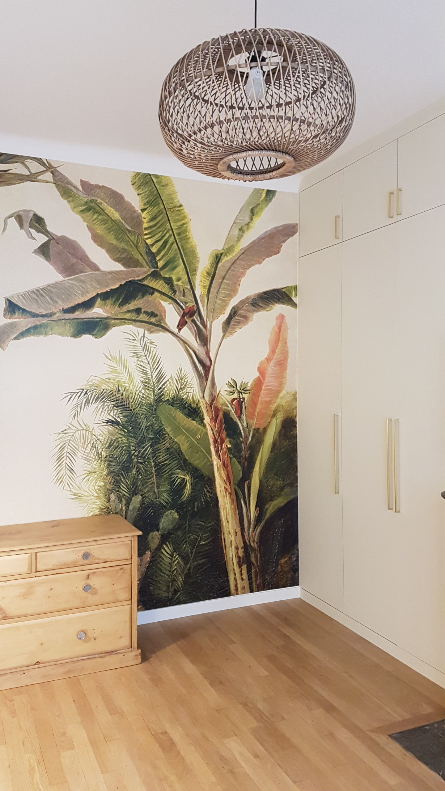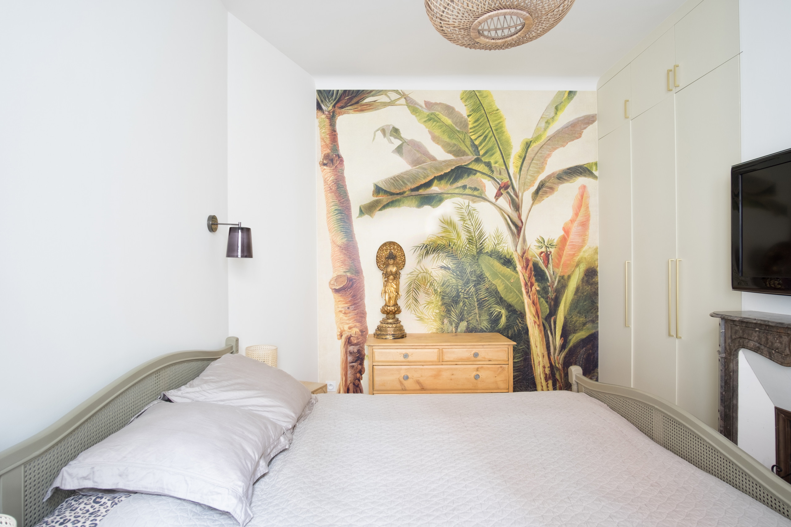 Après. Cette nouvelle chambre au design épuré reprend les codes de la pièce à vivre, avec un panoramique de jungle exotique, associé à une suspension en rotin et une commode en bois clair.