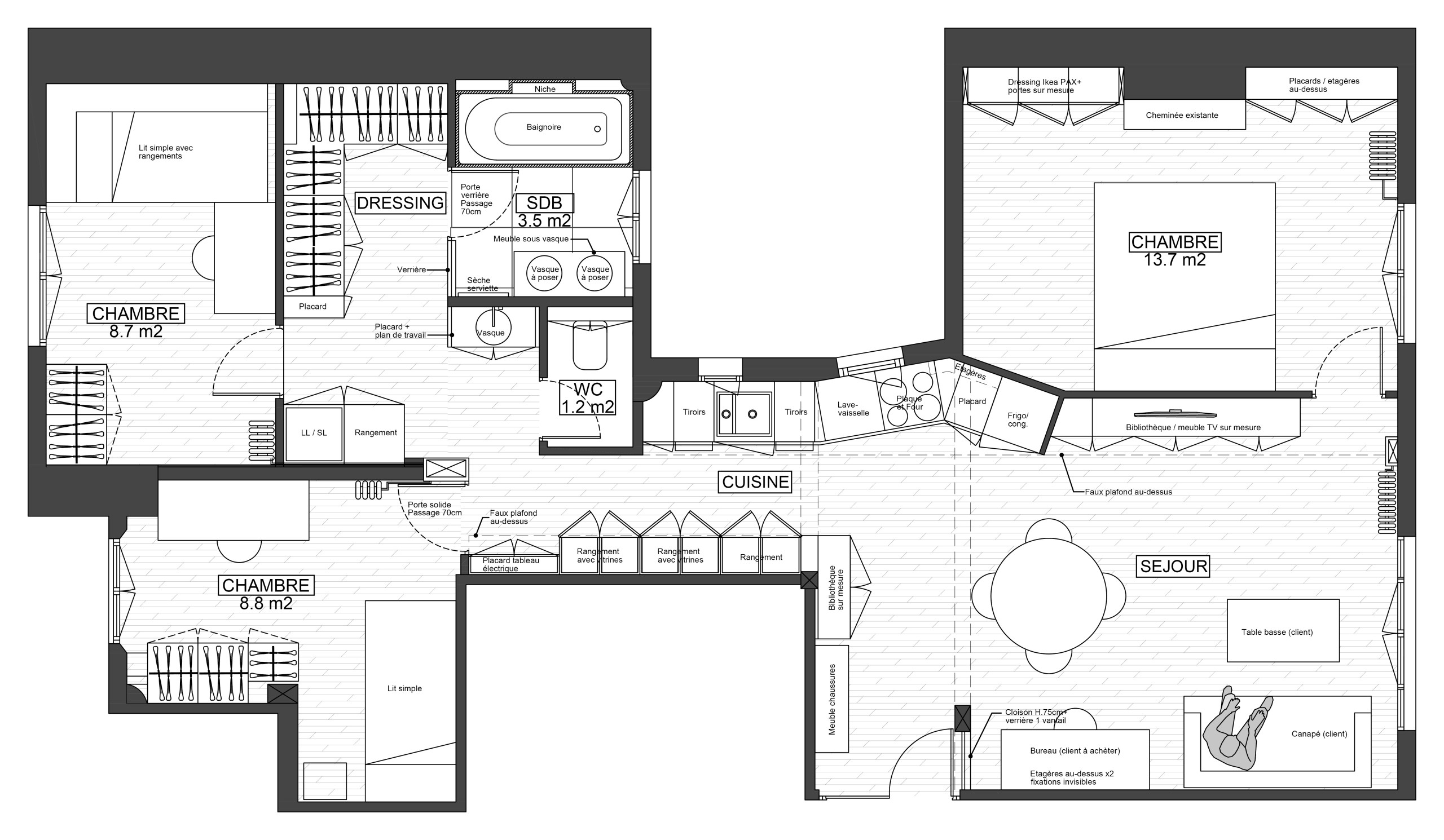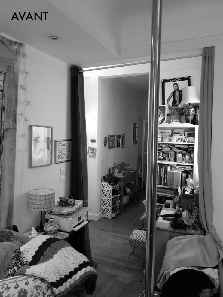 La propriétaire des lieux vit dans cet appartement du XVIIe arrondissement parisien depuis une dizaine d’années avec ses deux enfants de 16 et 17 ans. Niché au deuxième étage d’un immeuble du début du XXe siècle, ce 72 m² ne disposait que de deux chambres. La propriétaire avait installé son espace nuit dans le séjour. On trouvait donc un lit, la table de salle à manger ainsi que le canapé dans le même espace.