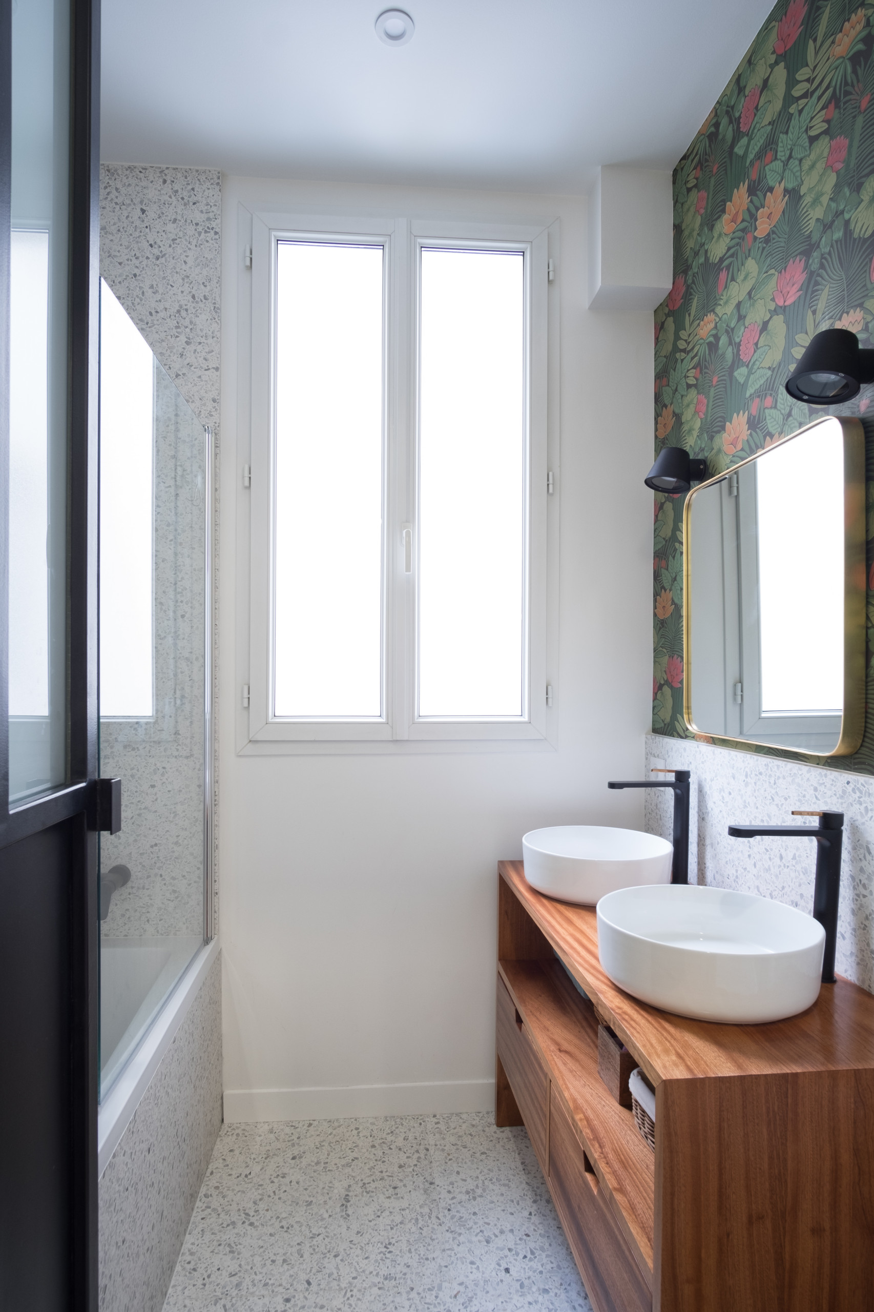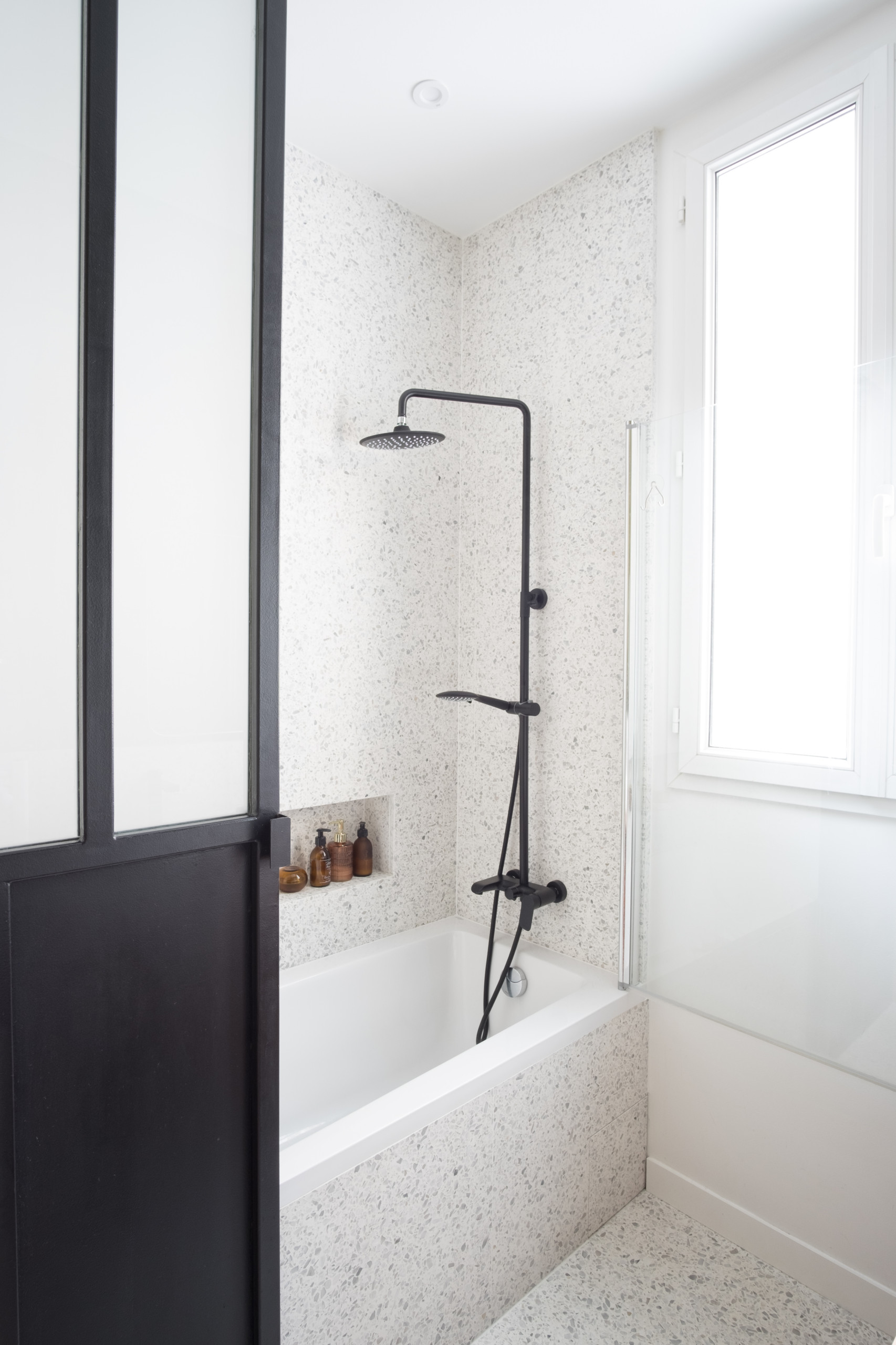 Toute la salle de bains a été traitée en blanc pour s’associer à un terrazzo black & white qui apporte beaucoup de cachet à cet espace.