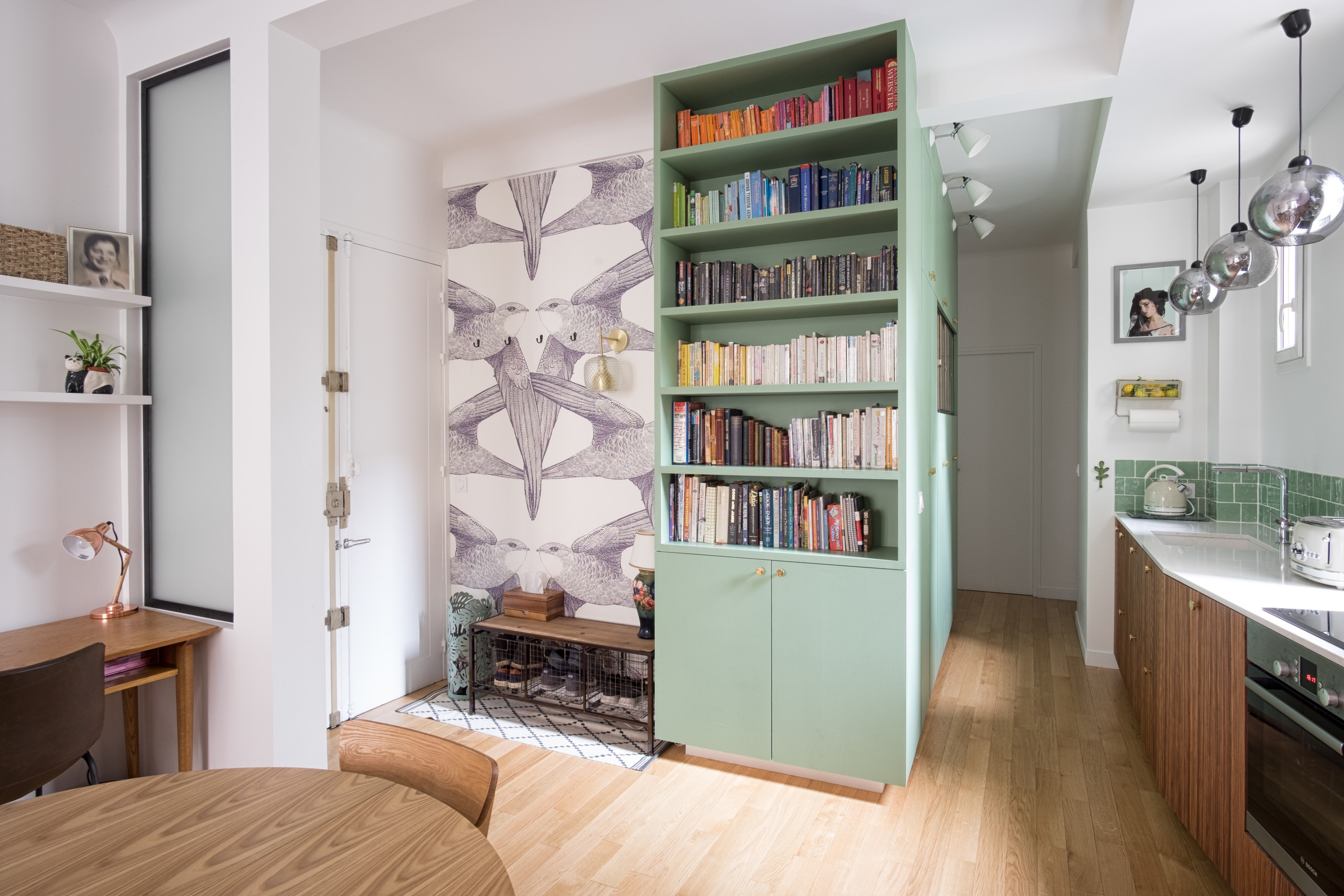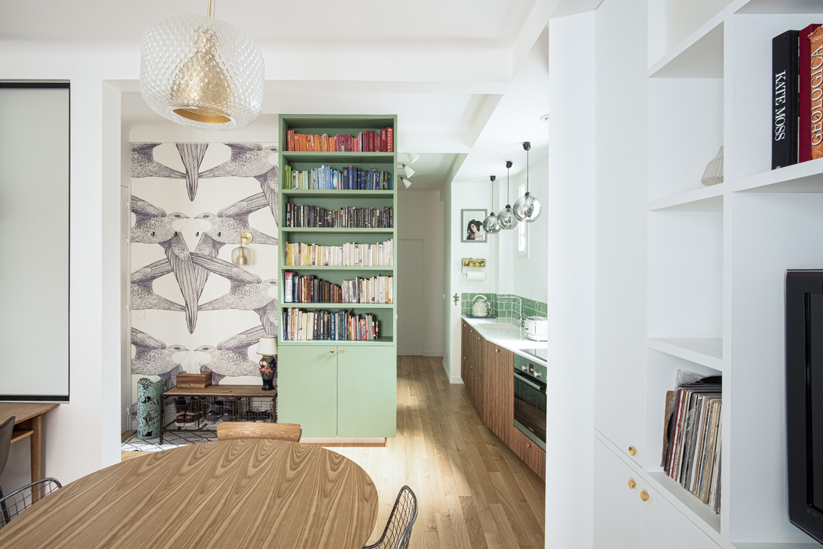 Aujourd’hui méconnaissable, cet appartement s’inspire principalement de la nature, habillé d’une palette de teintes végétales. « Dans l’entrée, la bibliothèque en medium se pare d’une délicate teinte verte, qui s’accorde à merveille avec ce papier peint poétique aux motifs d’oiseaux. Pour apporter un maximum de clarté et créer une ambiance joyeuse, j’ai imaginé dans ce havre de paix une ambiance exotique mêlant bois sombre et vert », commente l’architecte d’intérieur.