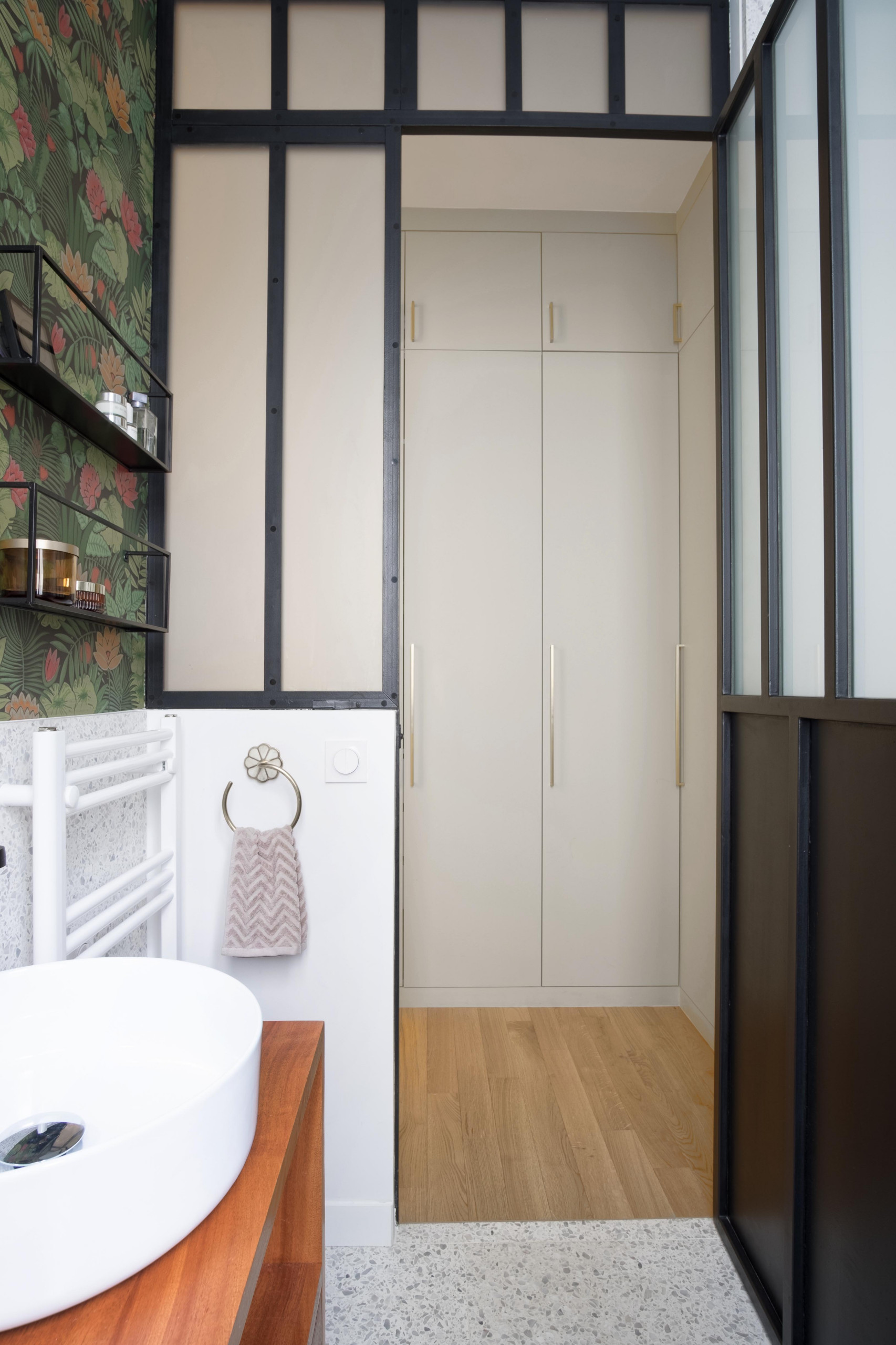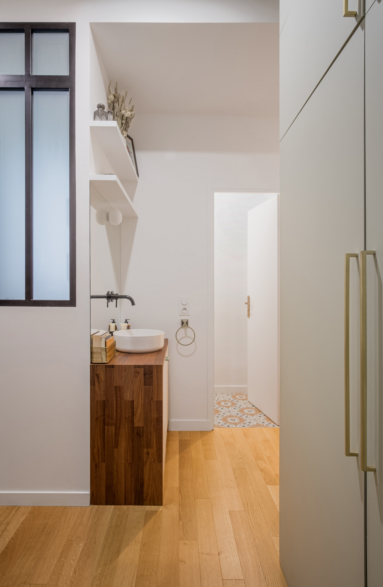 Après. « Dans la nouvelle salle de bains, nous avons créé une verrière équipée de vitres sablées pour apporter de la lumière naturelle dans le dressing attenant », précise Sarah.