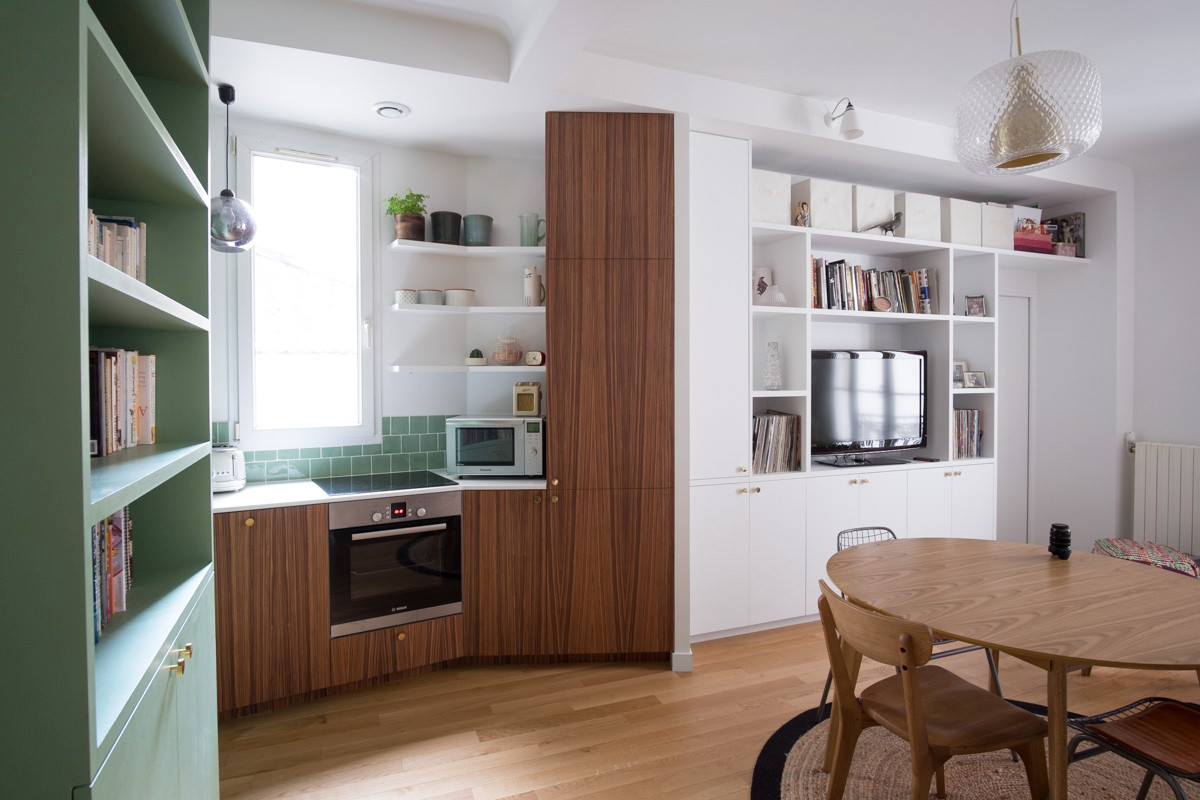 Une structure toute hauteur, réalisée sur mesure en medium peint, fait office de bibliothèque et de meuble TV, accueillant également une série de placards en partie basse. Le coin salle à manger mise, quant à lui, sur des matériaux naturels en associant une table ronde en bois au design rétro à une série de chaises dépareillées et un tapis en jute. À droite, on aperçoit la porte menant à la nouvelle chambre parentale.