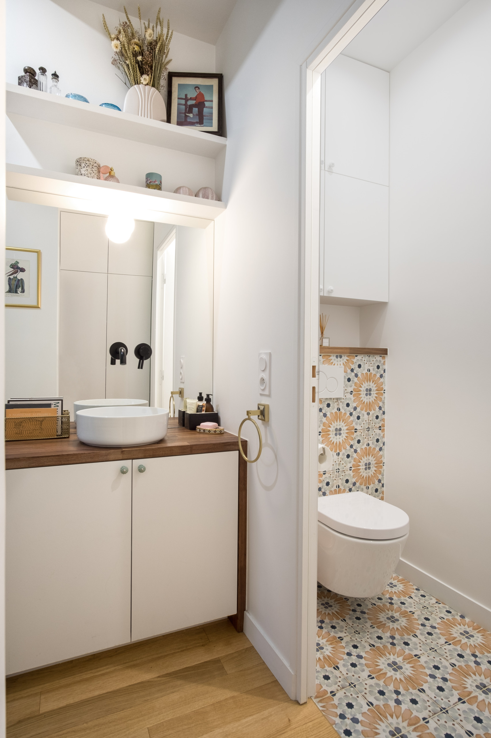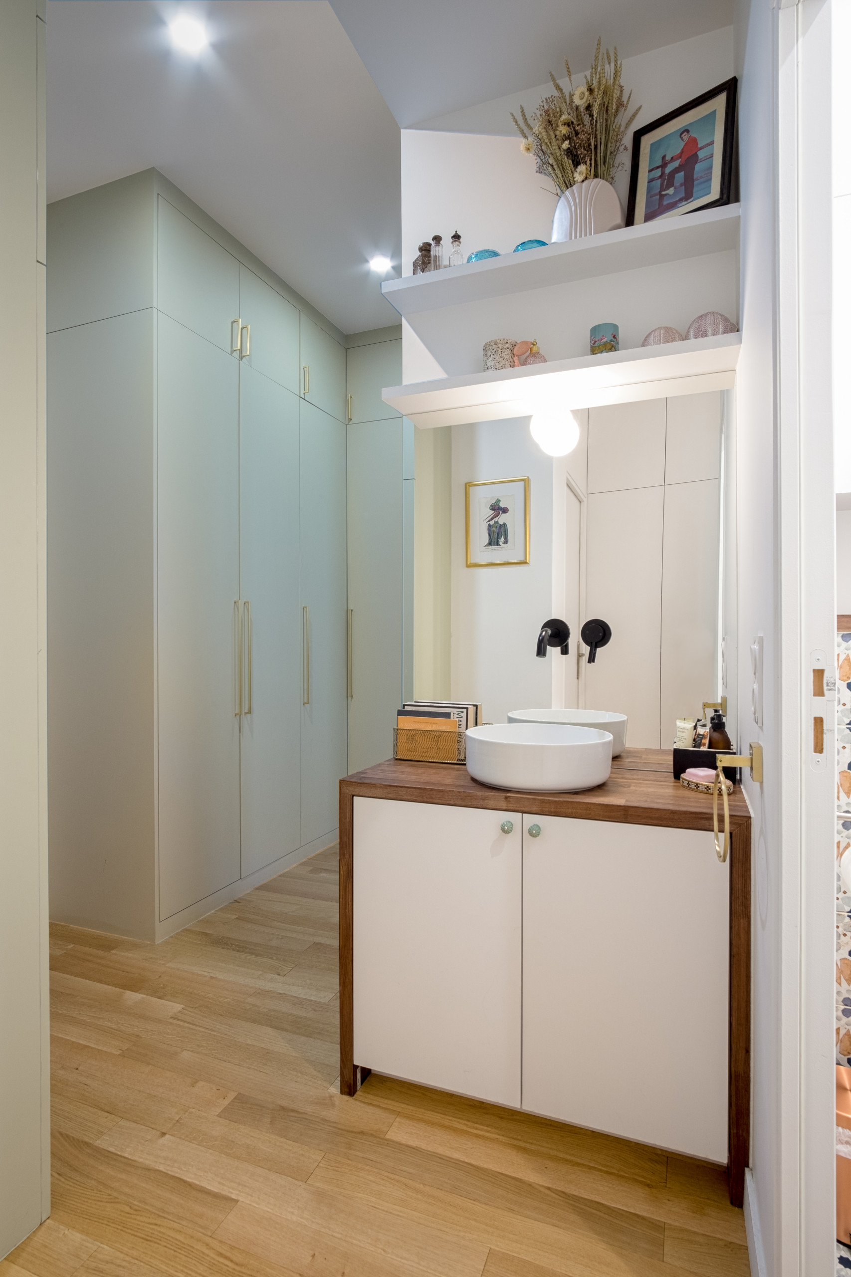 Un grand miroir sur mesure est surmonté par deux étagères permettant de poser quelques objets de décoration. Dessous, le meuble vasque, sur mesure également, se pare d’un plan de travail effet noyer.