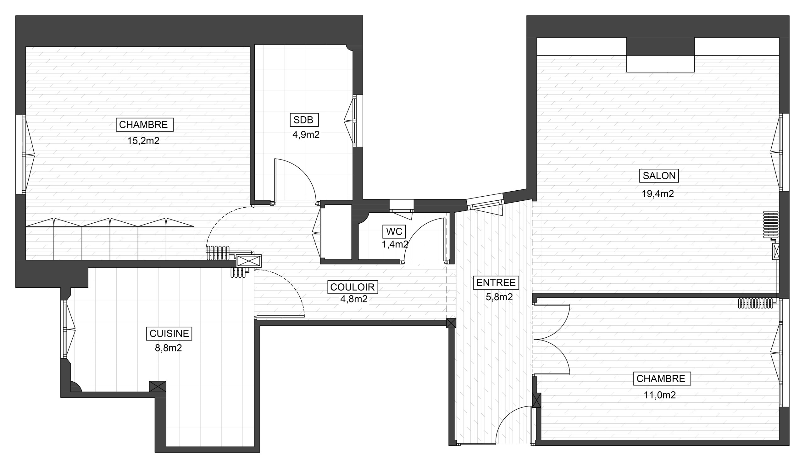 Le brief de départ impliquait de créer une chambre supplémentaire ainsi qu’une cuisine ouverte contemporaine, de maximiser les espaces de rangement et d’apporter de la lumière dans cet appartement sombre donnant sur une cour aveugle.