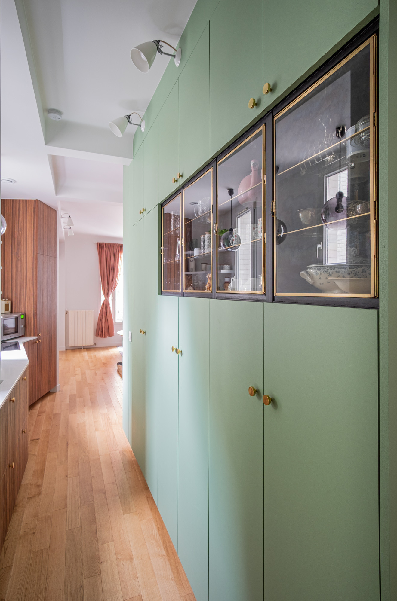 Vitrines : La Redoute ; Caissons : Ikea, façades sur mesure en medium peint ; Poignées en laiton : La Quincaillerie ; Appliques en porcelaine : Original BTC