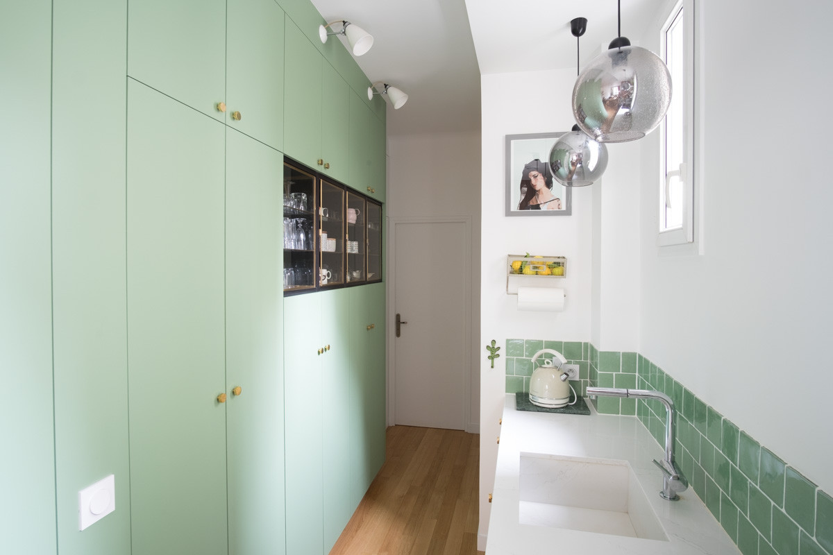 En face, des meubles toute hauteur de faible profondeur permettent de stocker la nourriture et le petit électroménager. Une vitrine a été intégrée à ces meubles provenant de la grande distribution pour animer le linéaire et mettre en valeur la jolie vaisselle de la propriétaire des lieux.