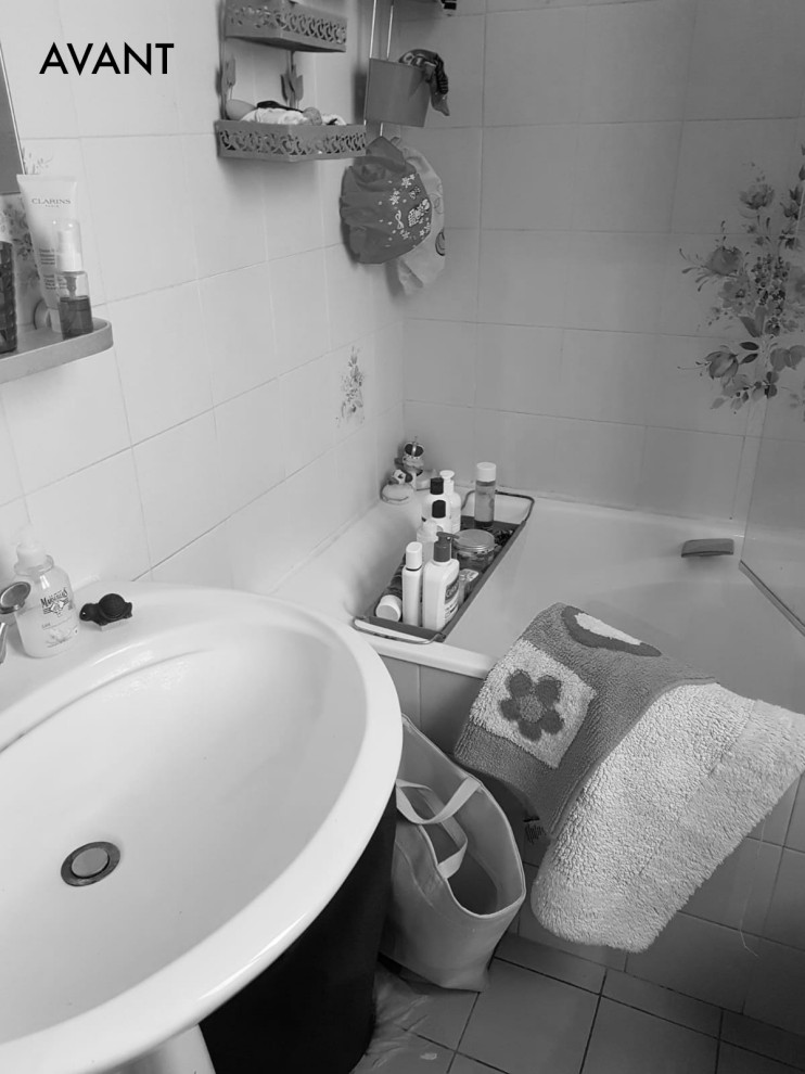 Avant. L’ancienne salle de bains était complètement démodée avec cette vasque vieillotte et ce carrelage au motif floral.