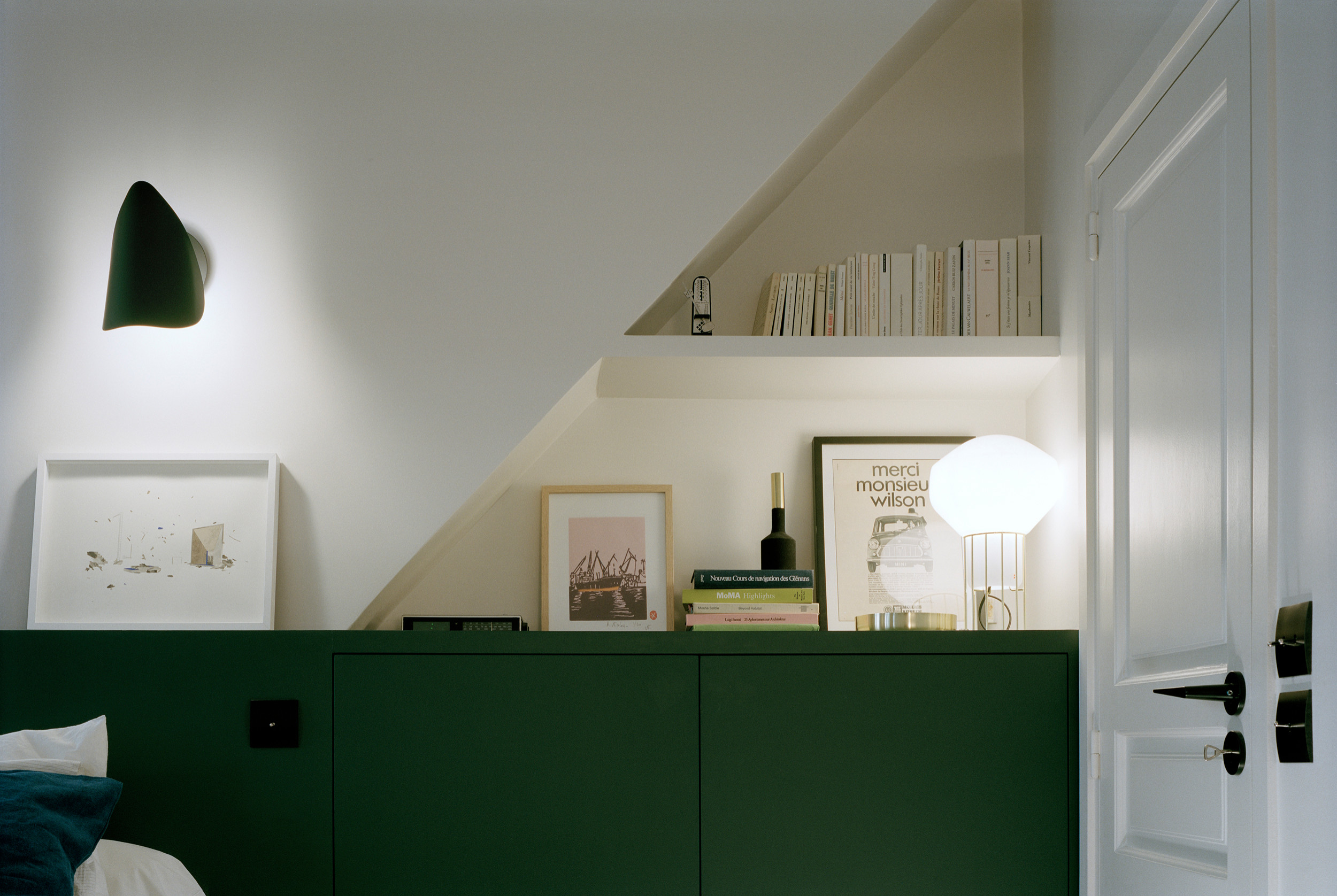 Après. Pour regagner de l’ergonomie, du rangement et du caractère, l’architecte a opté pour une tête de lit menuisée sur mesure en médium, peinte d’un vert profond. « La hauteur a été déterminée par l’intersection de la tablette avec le pan coupé du boisseau de cheminée », nous fait remarquer le pro toujours en quête de la ligne parfaite.
