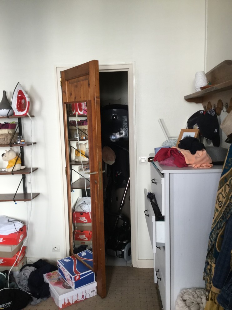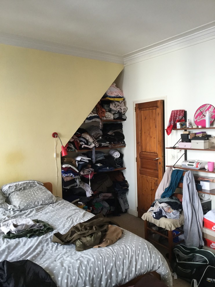 Avant. Voici à quoi ressemblait la chambre avant les travaux. Le lit était appuyé sur un ancien conduit de cheminée. À droite, des étagères servaient de dressing, à gauche se trouvait un petit placard fermé.