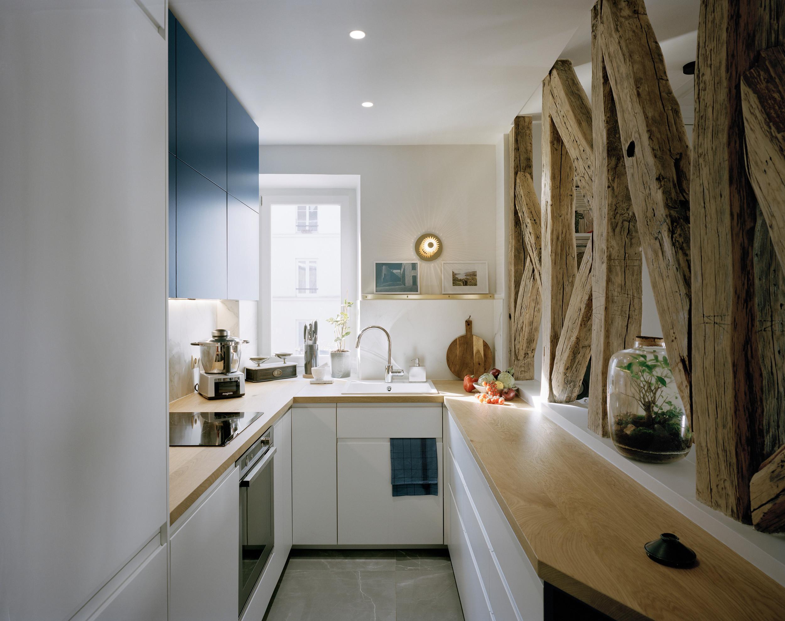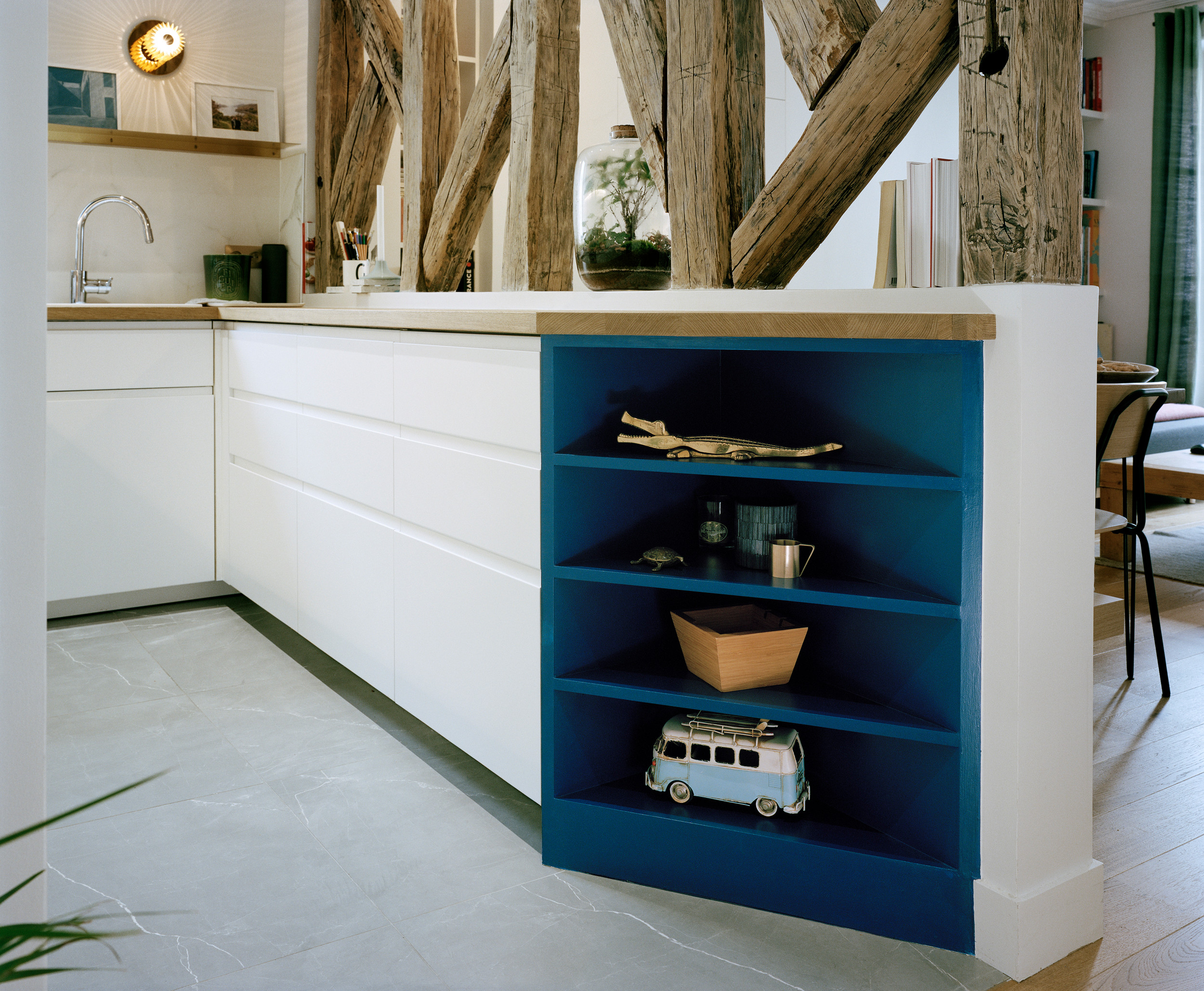 L’architecte, reconnaissant qu’il est facile de se tromper sur le plan d’une cuisine a planché sur le « dessin parfait » : il a dessiné une cuisine en U, soit l’un des plans les plus efficaces en termes d’usage et de rangement : « Côté mur se trouve un linéaire de 60 cm de profondeur pour l’électroménager avec des rangements toute hauteur », détaille-t-il.