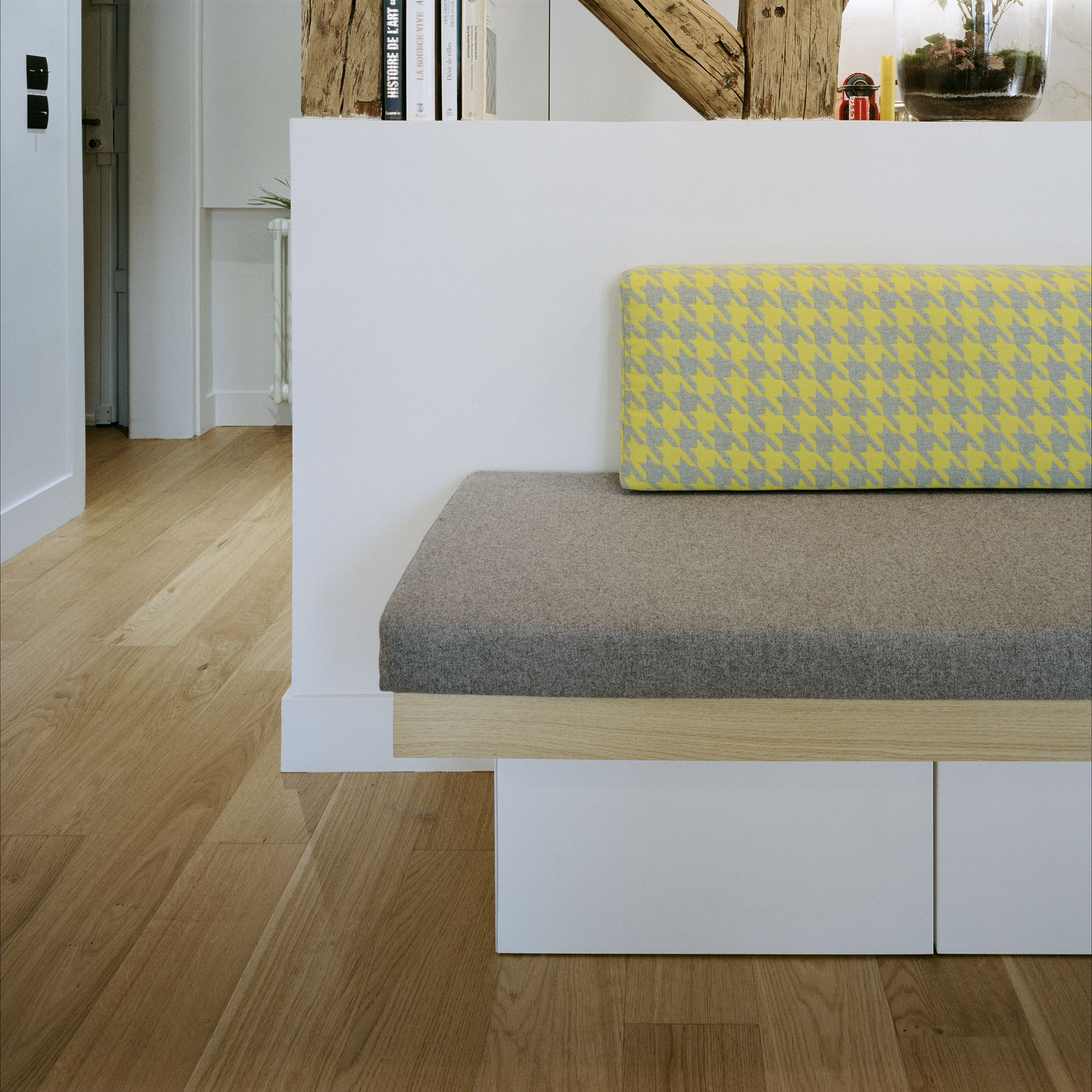 Un confortable coin banquette, comme dans un bistrot, s’adosse pour sa part à la semi-cloison : « Nous avons fait réaliser la banquette coffre sur mesure et recouvrir avec un tissu pied de coq jaune pour lui donner du peps. La table, quant à elle, est une réadaptation d’une ancienne table en chêne qui se trouvait dans l’appartement. J’essaie toujours de recycler, réagencer et profiter des matériaux de qualité lorsque c’est possible », explique l’architecte.