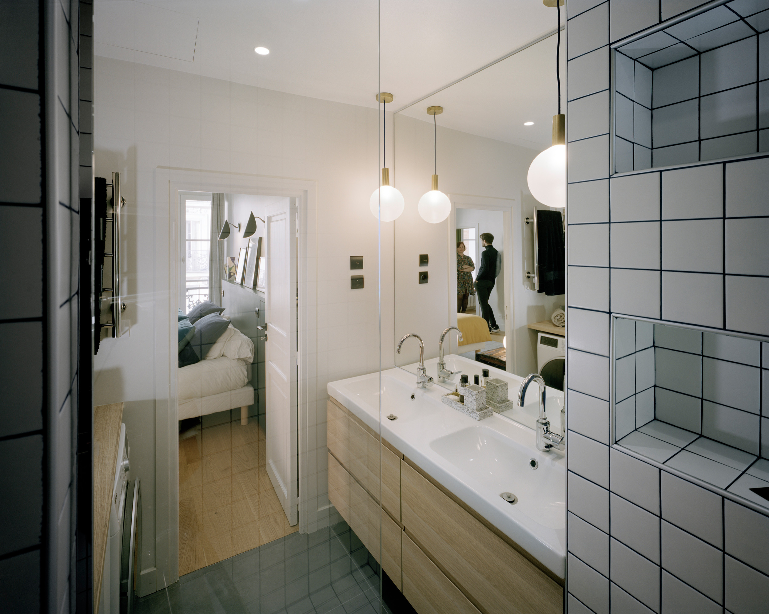 On note encore le grand miroir découpé sur mesure au-dessus du plan vasque qui élargit virtuellement l’espace et l’astuce d’éclairage de l’architecte : « Les suspensions en laiton, comme dans une pièce de vie, réchauffent la pièce et sont à une hauteur parfaite pour être bien éclairé pour se raser, se maquiller… »