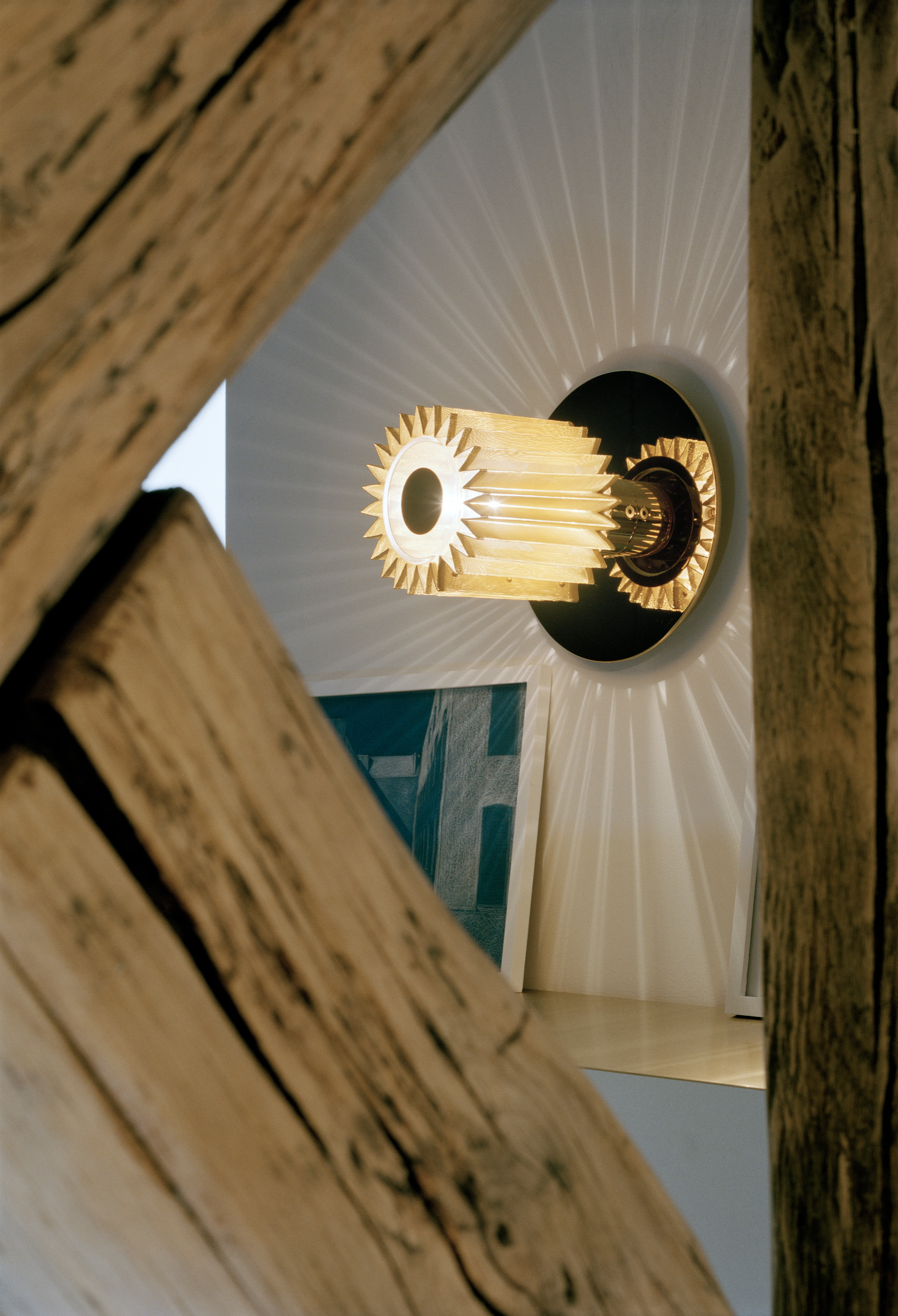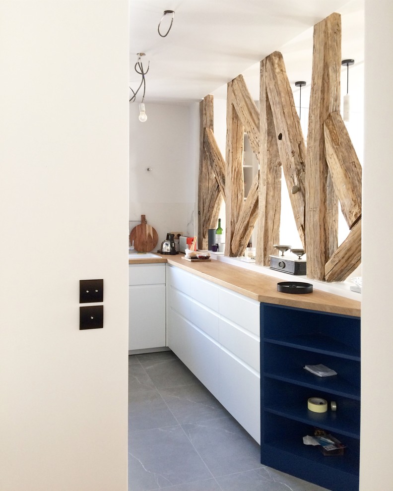 Avant. Franchi la minuscule entrée qui dessert aussi les toilettes séparées, la visite commence par la pièce de vie. Placée quasiment au centre, une cloison épaisse en maçonnerie et poutres massives séparait la cuisine du salon. « Mon client voulait s’en débarrasser car il était à la recherche d’un intérieur contemporain et lumineux. J’ai réalisé une étude structure et compris que cette cloison n’était pas porteuse. Les poutres avaient dû être récupérées d’un cloisonnement historique et replacées là : l’ancêtre des claustras en somme. Je lui ai conseillé de tenter un sablage et, devant le bel éclaircissement, presque du bois flotté, nous avons décidé de remonter en cloison de sorte à séparer la cuisine et le séjour. Je n’étais pas partisan d’une énième verrière atelier. Je suis attentif à conserver le cachet historique lorsque c’est possible », affirme l’architecte.