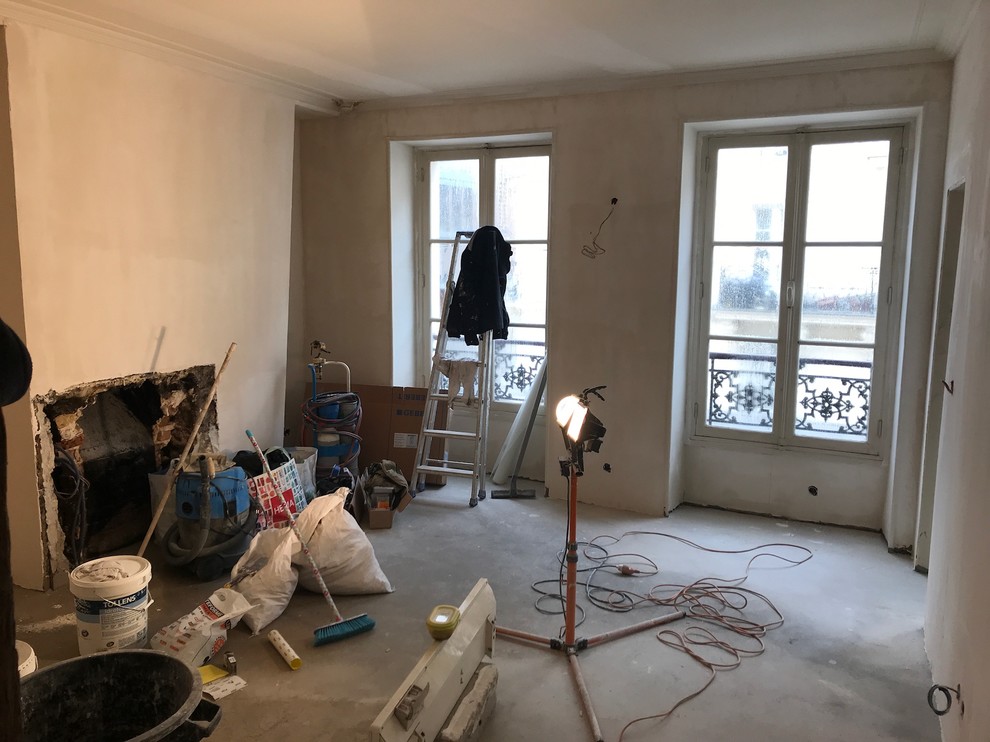Avant. Voici une photo de la pièce de vie en cours de travaux. À ce stade, la semi-cloison avait été déposée et le sol ragréé. « Pour remplacer les deux fenêtres simple vitrage sur rue côté séjour, le propriétaire a choisi des menuiseries bois qui imitent les fenêtres historiques, afin de ne pas dénaturer la belle façade de l’immeuble de faubourg », poursuit Nicolas Bossard. Ce dernier a ensuite fait des études pour savoir s’il devrait isoler le mur de façade mais devant les bons résultats thermiques engendrés par les doubles vitrages, il a simplement décidé de remplacer les radiateurs « grille-pain » par des modèles performants. « Le propriétaire a opté pour des radiateurs plinthes électriques qui imitent les modèles en fonte anciens. Commandés par un thermostat, ils offrent une qualité de chaleur presque équivalente à un chauffage central grâce à la technologie de l’inertie fluide », détaille l’architecte.