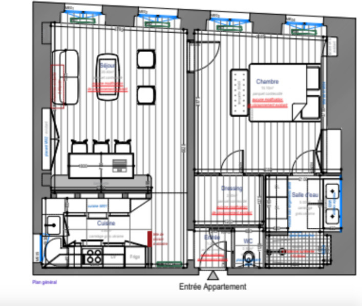 Il a également fallu remplacer l’intégralité du réseau électrique. Des faux plafonds ont été créés au niveau des pièces humides à cet effet, ce qui a également permis d’installer une VMC et de faire passer un réseau RJ45. « Le propriétaire souhaitait disposer d’un réseau internet filaire pour travailler à domicile sans wi-fi », explique le pro.